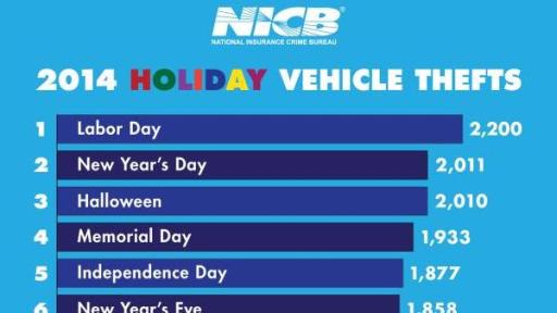 Holiday car thieves had their busiest day in 2014 on, ironically, Labor Day, stealing 2,200 vehicles according to new data released today by the National Insurance Crime Bureau (NICB). NICB’s 2014 Annual Holiday Vehicle Theft Report analyzes data from the National Crime Information Center (NCIC), which showed a total of 695,246 vehicle thefts for the year.