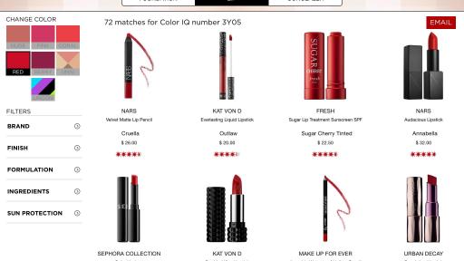 SEPHORA + PANTONE Color IQ for Lip leverages PANTONE’s color science and the power of SEPHORA’s artistry expertise to find the perfect lip color. Based on the results of your scientific foundation match, and invoking SEPHORA’s know-how about undertones and color harmonies, the results are inclusive of all colors, formulas and brands carried by SEPHORA. Clients can select from over 3,500 lip shades in seven color families like nude, pink, berry, coral or red and results can even be sorted further by texture, finish, and format, then emailed directly for future reference.
