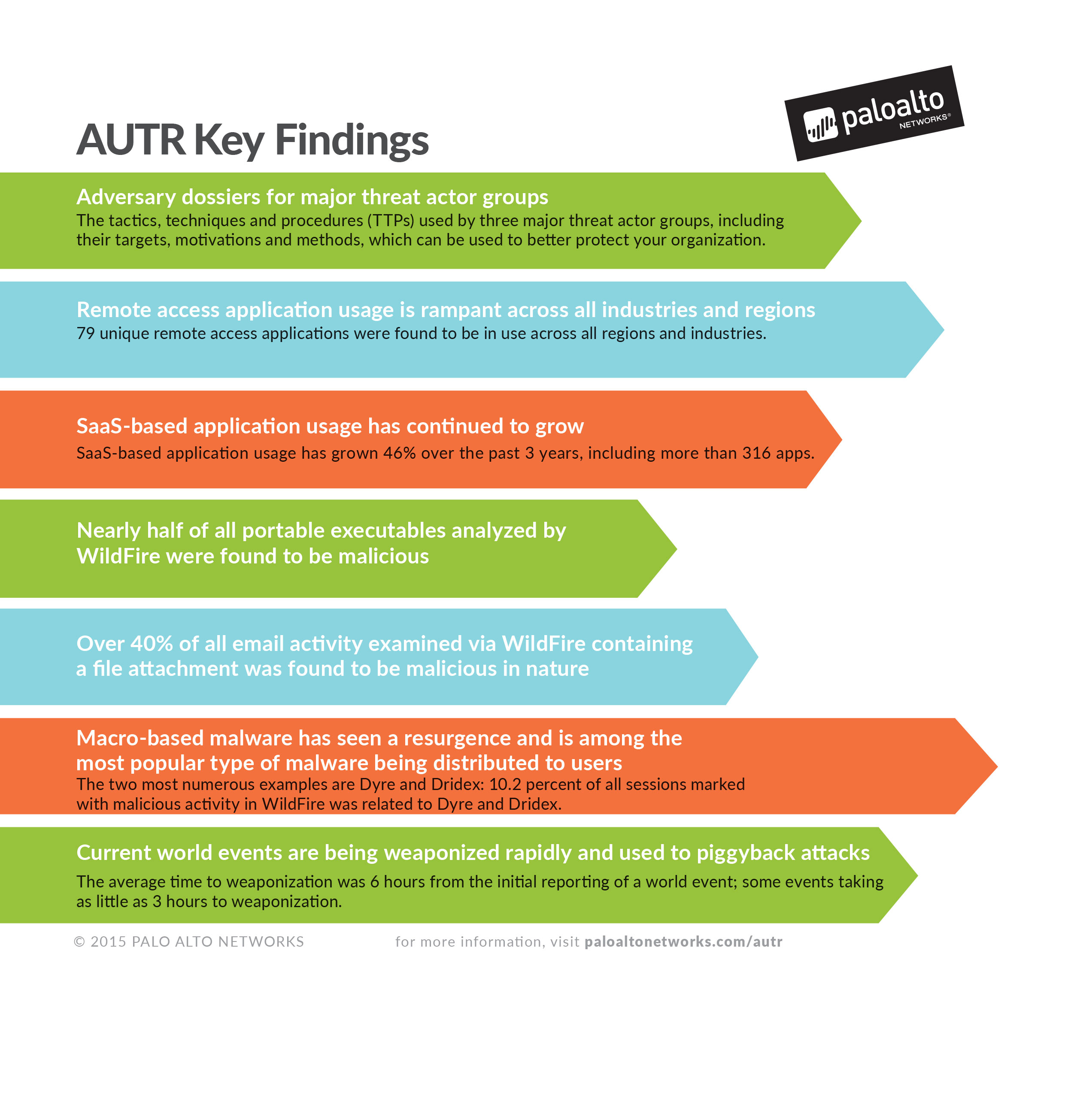 Source material for the report comes from real-world data provided by more than 7,000 enterprise organizations with the Palo Alto Networks security platform deployed. In total, the analysis done for the report included over 65 petabytes of data from WildFire™ and AutoFocus™ subscriptions. The 2015 AUTR is the 12th edition of the report.