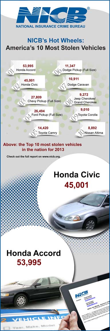 About the National Insurance Crime Bureau: headquartered in Des Plaines, Ill., the NICB is the nation’s leading not–for–profit organization exclusively dedicated to preventing, detecting and defeating insurance fraud and vehicle theft through data analytics, investigations, training, legislative advocacy and public awareness. The NICB is supported by more than 1,100 property and casualty insurance companies and self–insured organizations. NICB member companies wrote $371 billion in insurance premiums in 2013, or more than 78 percent of the nation’s property/casualty insurance. That includes more than 93 percent ($168 billion) of the nation's personal auto insurance. To learn more visit www.nicb.org.