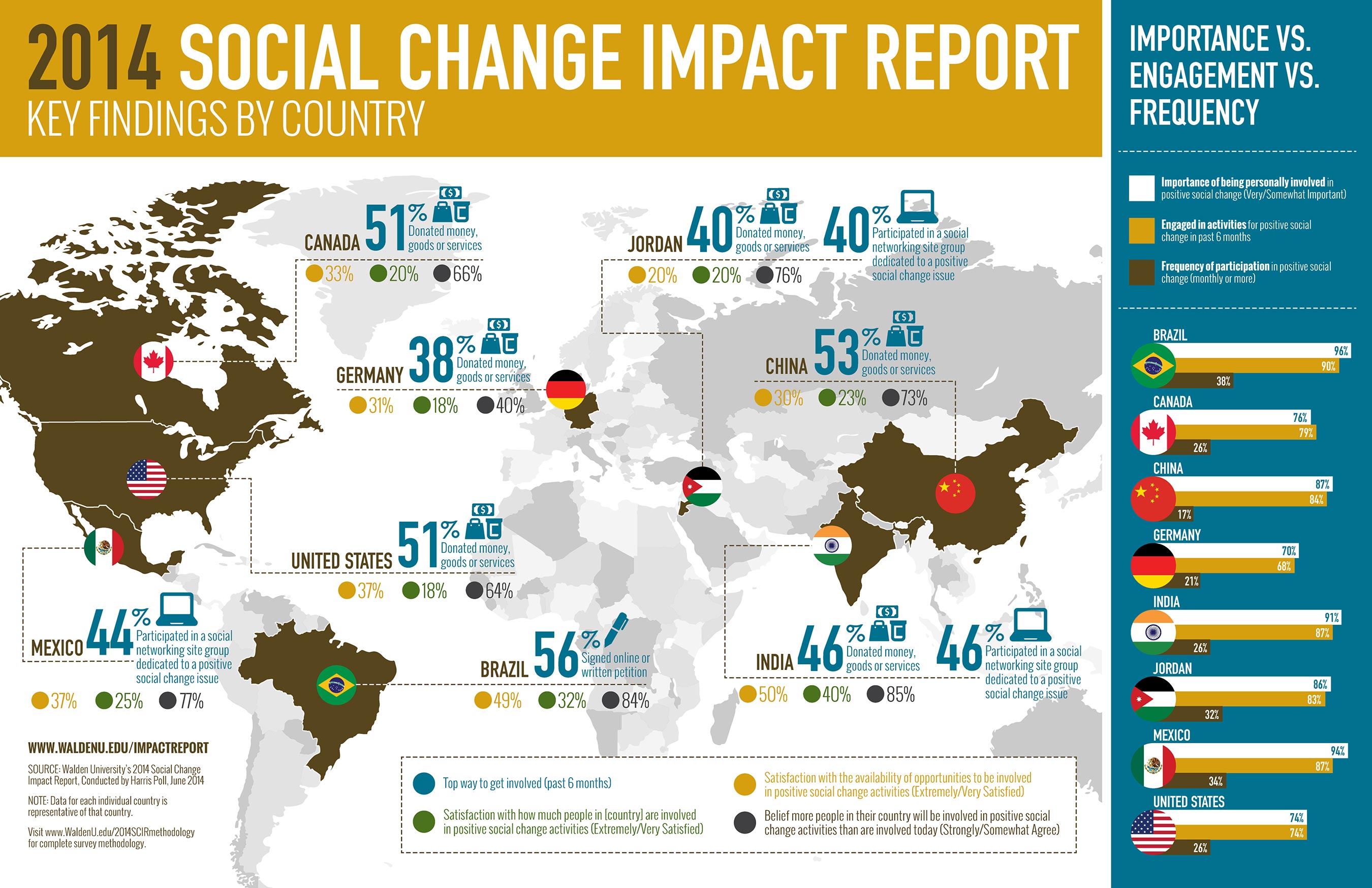 The 2014 Social Change Impact Report survey was conducted online by Harris Poll on behalf of Walden University between June 1 and 17, 2014, among a total of 9,138 adults within Brazil (1,009 adults ages 18–64), Canada (1,003 adults ages 18–64), China (1,021 adults ages 18–64), Germany (1,000 adults ages 18–64), India (1,021 adults ages 18–64), Jordan (1,027 adults ages 18 and older), Mexico (1,020 adults ages 18–64), and the U.S. (2,037 adults age 18 and older). Data for each country were weighted to the general or online population within each country. The “Average Result” is the arithmetic average across the countries. This measure does not account for differences in population size and thus is not representative. This online survey is not based on a probability sample, and therefore no estimate of theoretical sampling error can be calculated. A complete survey methodology is available upon request by contacting Jen Raider at 1-443-627-7452 or [email protected].