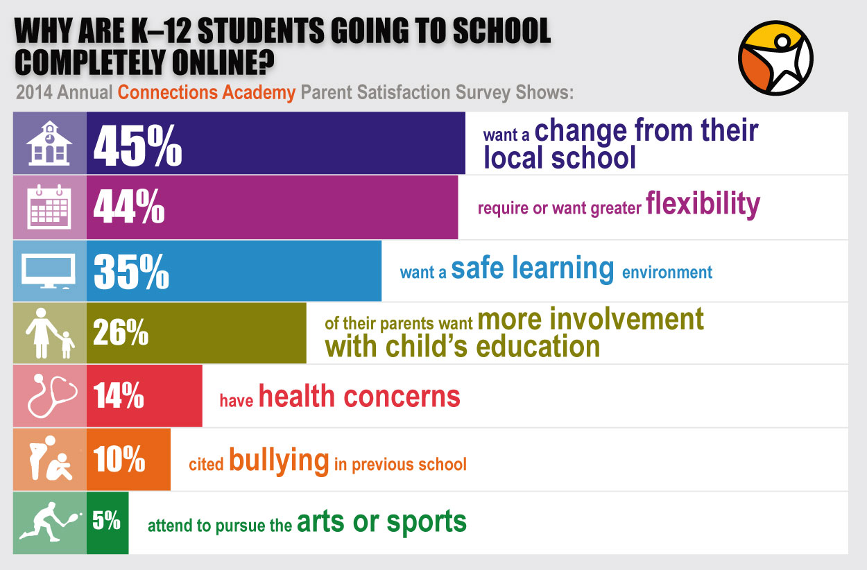 The Connections Academy parent survey also showed that other frequent factors leading parents to enroll students in the fully online schools included: the desire to have a greater involvement with their child’s education (26%); student health issues (14%); a child bullied in his/her previous school (10%); and student arts or athletic pursuits (5%).