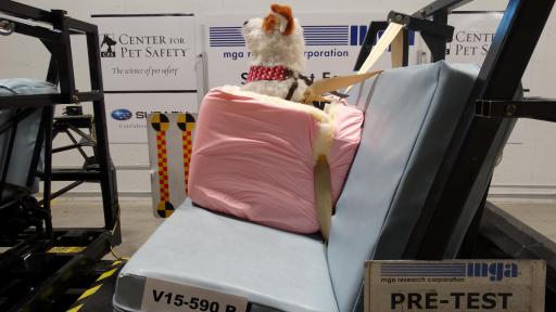 Conducted at MGA Research Corporation, an independent National Highway Traffic Safety Administration (NHTSA) contracted testing laboratory, the Pet Travel Seat Pilot Study focused on crash testing products using the Federal Motor Vehicle Safety Standard crash conditions for child safety seats. Tests were conducted using specially designed crash test dogs at a variety of different weights and sizes.