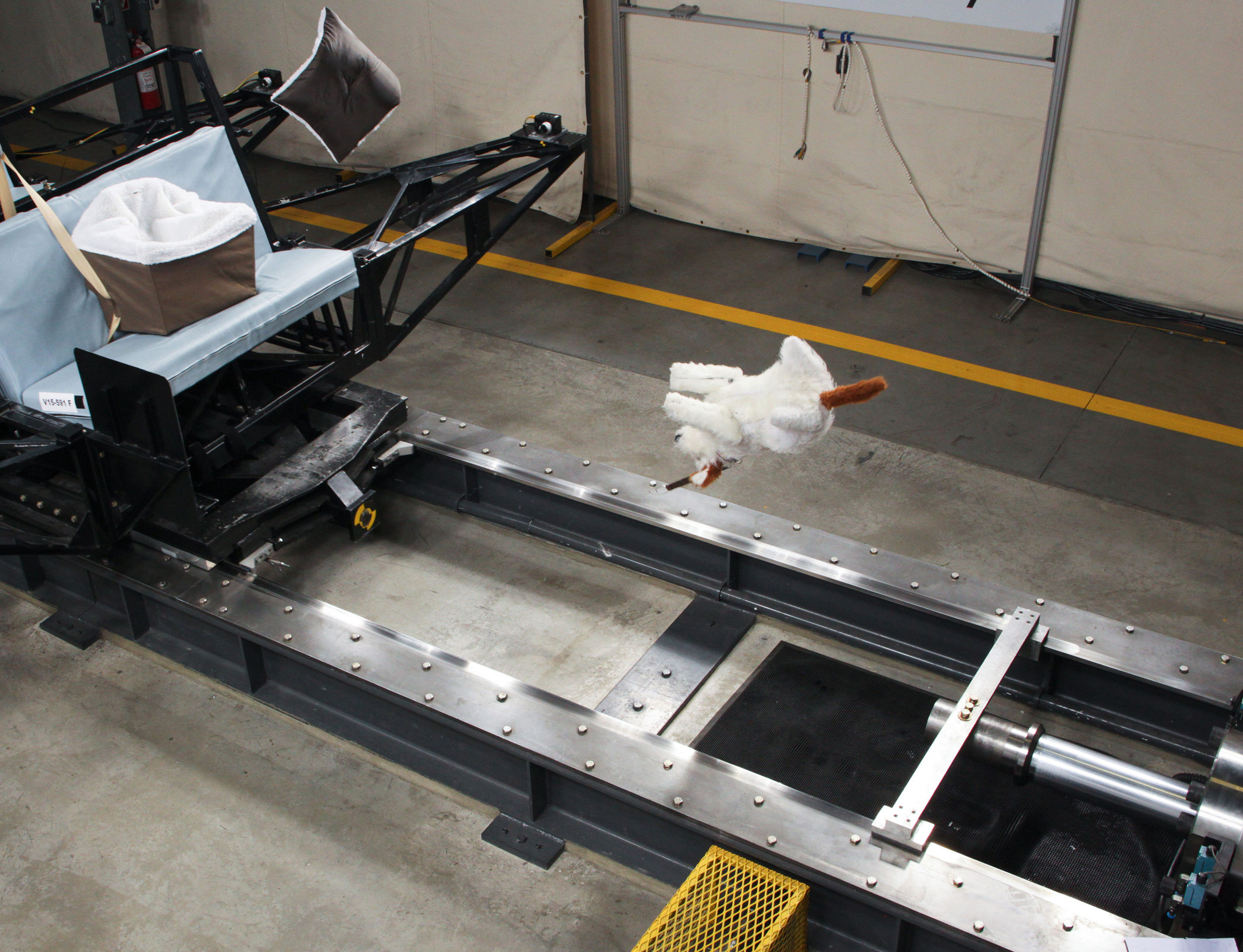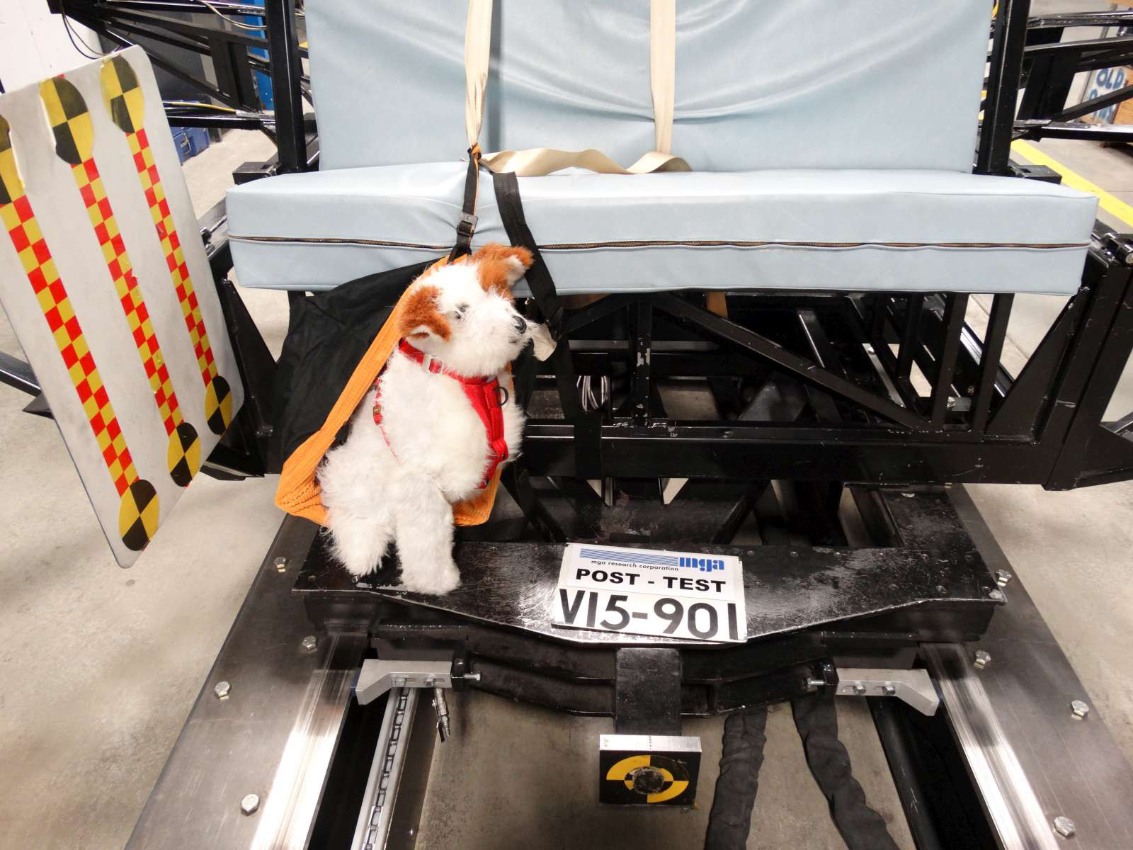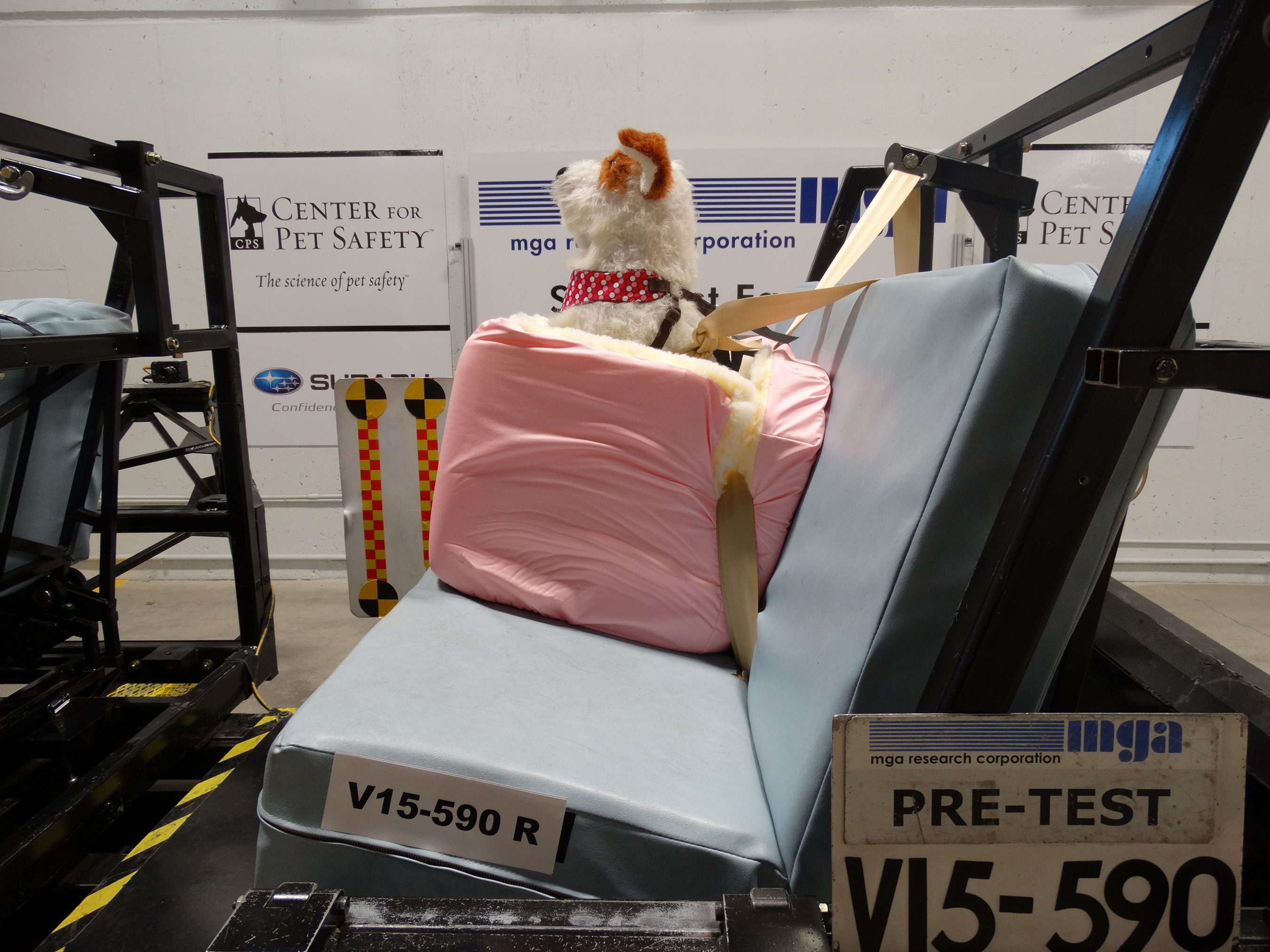Conducted at MGA Research Corporation, an independent National Highway Traffic Safety Administration (NHTSA) contracted testing laboratory, the Pet Travel Seat Pilot Study focused on crash testing products using the Federal Motor Vehicle Safety Standard crash conditions for child safety seats. Tests were conducted using specially designed crash test dogs at a variety of different weights and sizes.