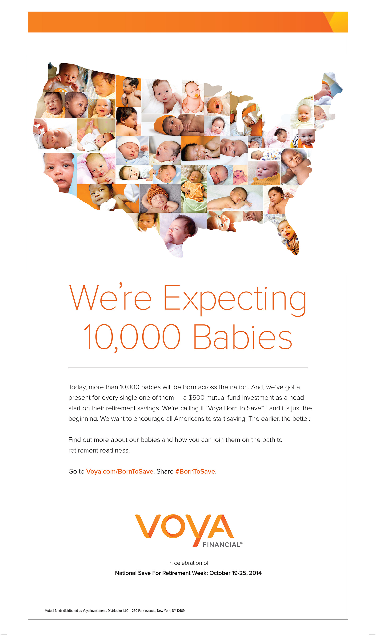 To learn more about the Voya Born to Save program, and to find out if a newborn you welcomed on October 20, 2014 is eligible to receive their complimentary $500 mutual fund investment from Voya Financial, please visit http://voya.com/borntosave. Parents and guardians of eligible babies must register for this offer by December 19, 2014.