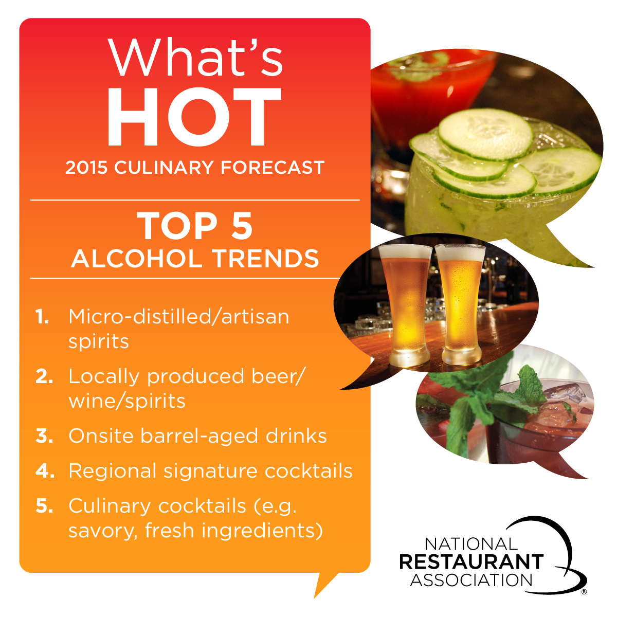 On the drink menu, the What’s Hot in 2015 survey predicts the top five alcohol and cocktail trends will be: