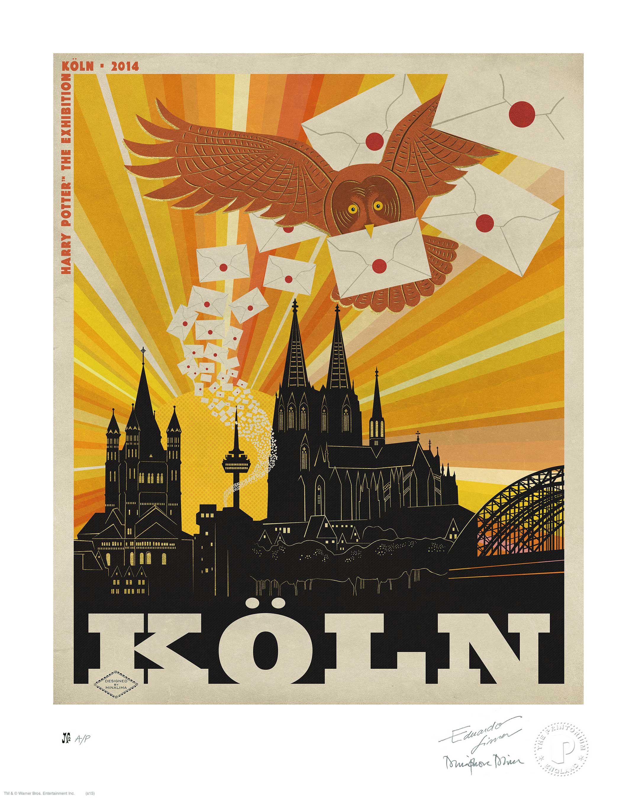 This original Harry Potter film and Cologne-inspired artwork–which measures 40 cm (W) by 50 cm (H)–is limited to 300 prints and features the famous Cologne landmarks Kölner Dom, Great St. Martin Church, Love Locks Bridge, the Rhine river and the Harry Potter-inspired post owl. Each print is hand-numbered and signed by the artists, printed with pigment-based inks on Hahnemühle fine art paper, features an embossed gold seal and certificate of authenticity, and is available for purchase at the exhibition retail shop for 199€.