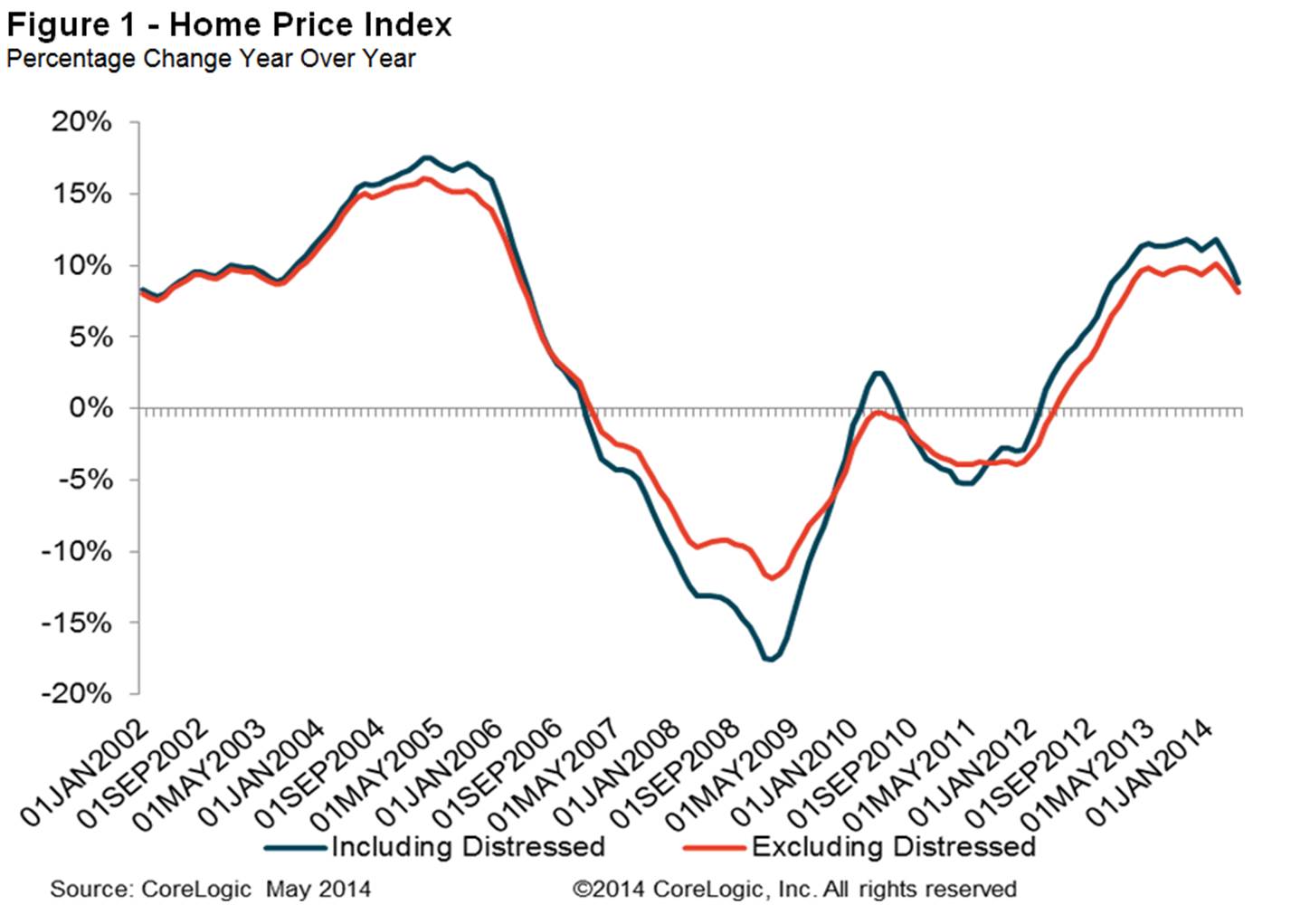 The CoreLogic HPI Forecast indicates that home prices, including distressed sales, are projected to increase 0.8 percent month over month from May 2014 to June 2014 and, on a year-over-year basis by 6.0 percent (+/- 1.5 percent)** from May 2014 to May 2015. Excluding distressed sales, home prices are expected to rise 0.7 percent month over month from May 2014 to June 2014 and by 5.1 percent (+/- 1.5 percent)** year over year from May 2014 to May 2015. The CoreLogic HPI Forecast is a monthly projection of home prices built on the CoreLogic HPI and other economic variables. Values are derived from state-level forecasts by weighting indices according to the number of owner-occupied households for each state.