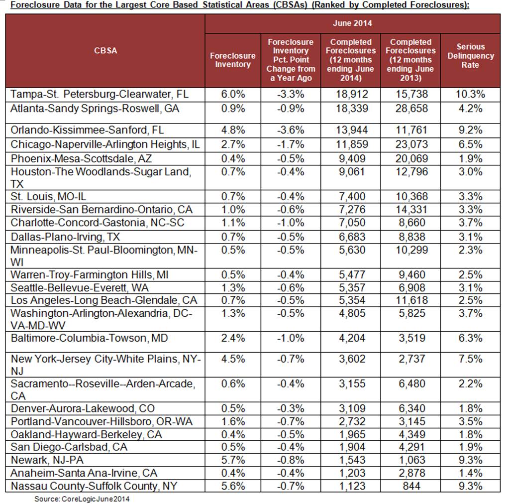 Foreclosure Data for the Largest Core Based Statistical Areas (CBSAs) (Ranked by Completed Foreclosures):