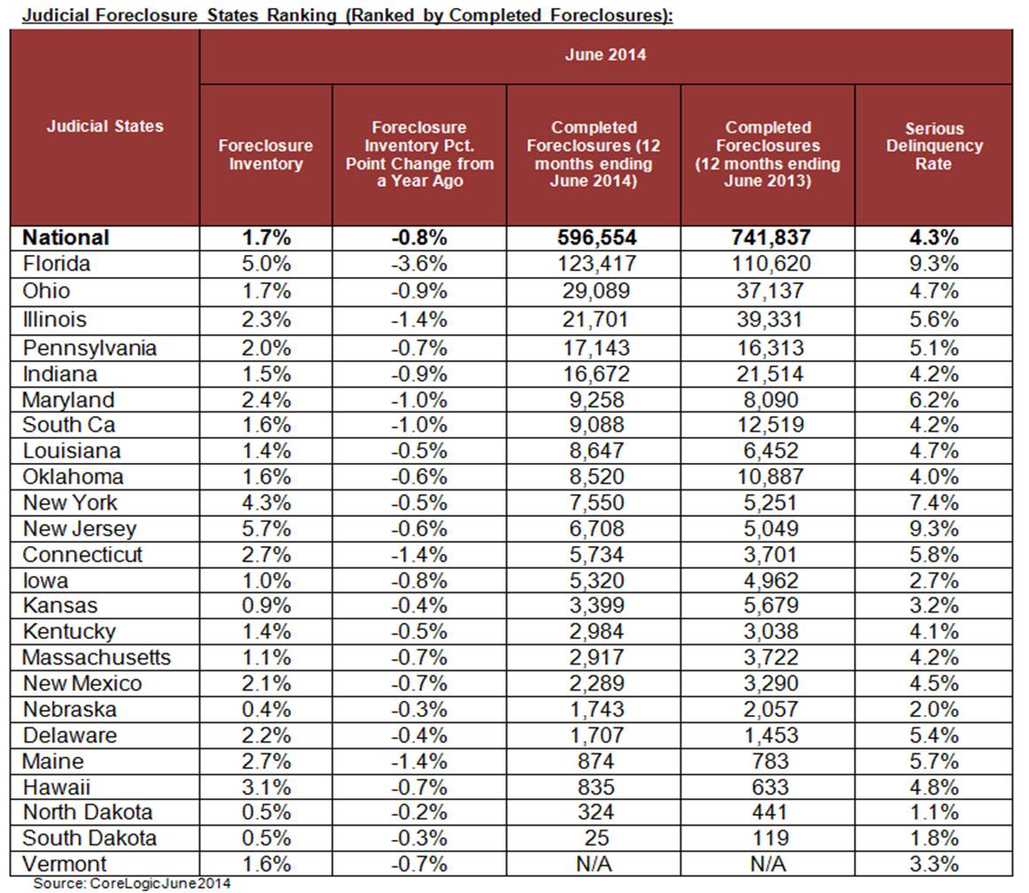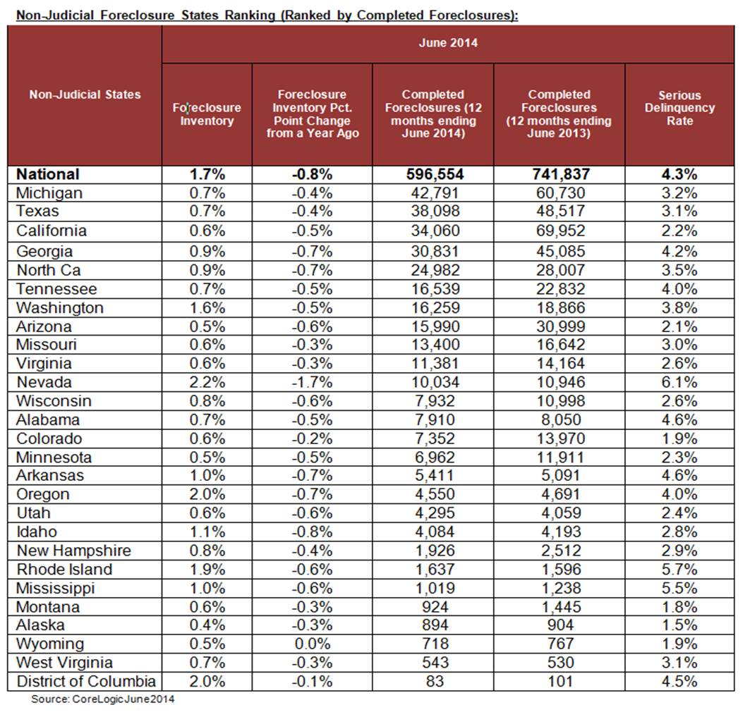 - The five states with the highest number of completed foreclosures for the 12 months ending in June 2014 were: Florida (123,000), Michigan (43,000), Texas (33,000), California (34,000) and Georgia (31,000).These five states account for almost half of all completed foreclosures nationally.