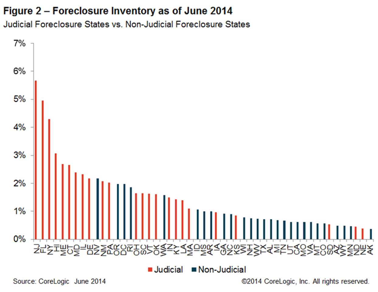 “While 32 straight months of year-over-year decline in the foreclosure rate is cause for celebration, the total number of homes still in the foreclosure process remains almost four times as high as the average in the early 2000s,” said Mark Fleming, chief economist for CoreLogic. “Additionally, there is concern over whether or not we can maintain this pace of improvement as the foreclosure inventory becomes more concentrated in judicial states with lengthier, more complex processes and timelines.”