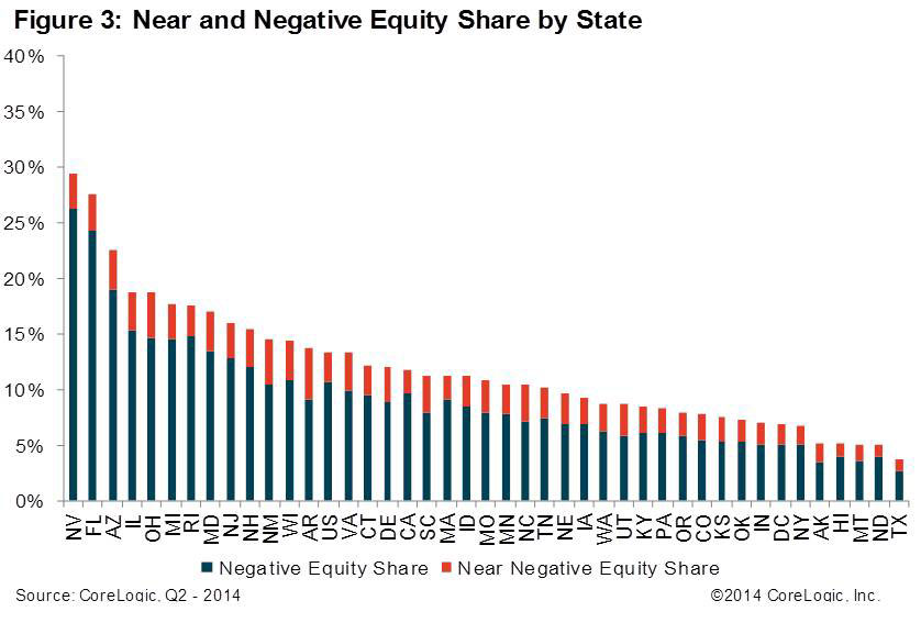 - Nevada had the highest percentage of mortgaged properties in negative equity at 26.3 percent, followed by Florida (24.3 percent), Arizona (19.0 percent), Illinois (15.4 percent) and Rhode Island (14.8). These top five states combined account for 32.8 percent of negative equity in the United States.