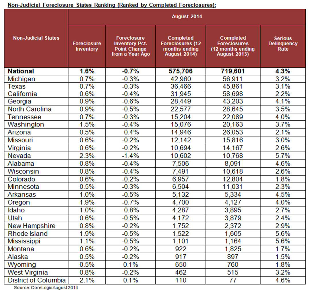 - The five states with the highest number of completed foreclosures for the 12 months ending in August 2014 were: Florida (121,000), Michigan (43,000), Texas (36,000), California (32,000) and Georgia (28,000).These five states account for almost half of all completed foreclosures nationally.