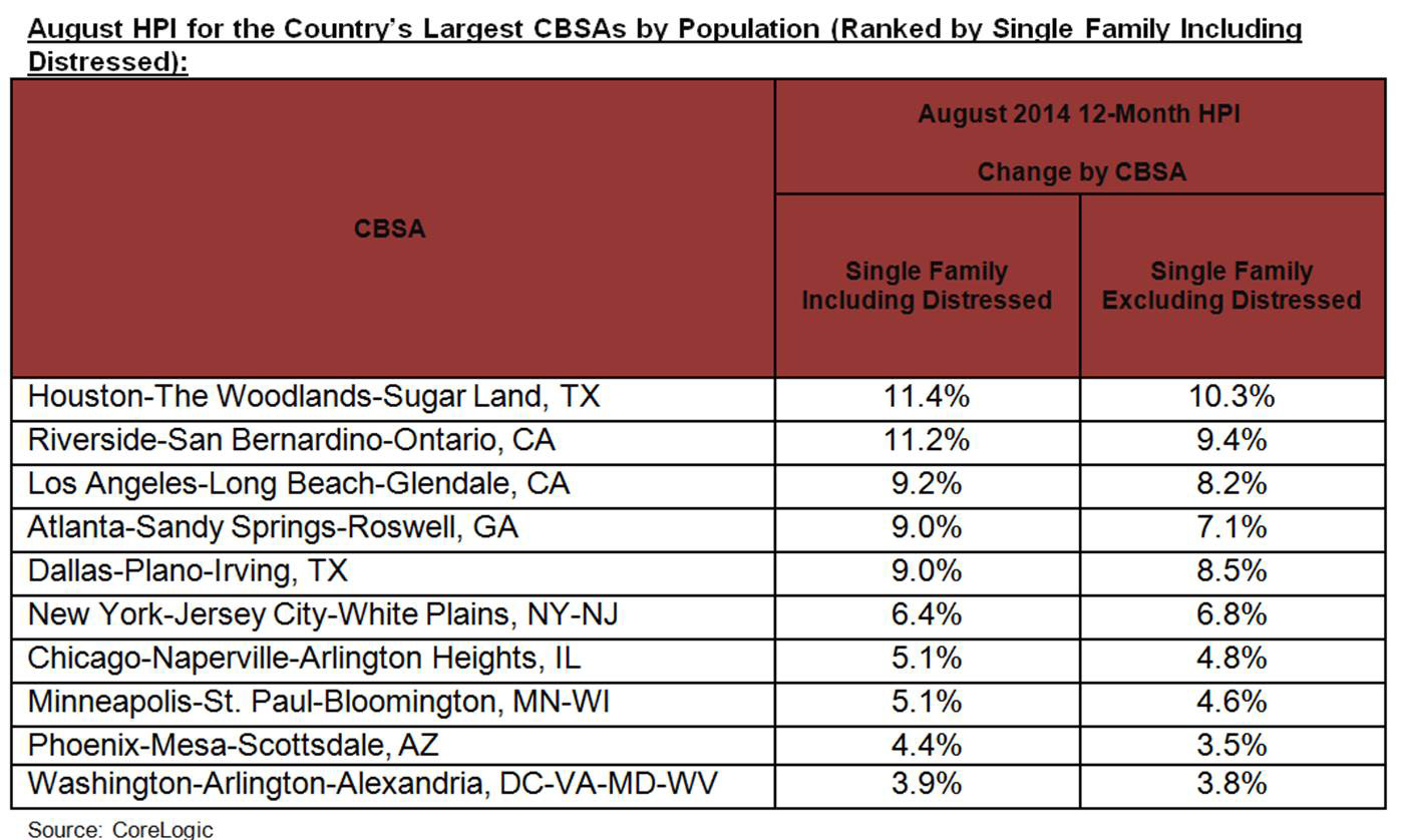 - Ninety-eight of the top 100 Core Based Statistical Areas (CBSAs) measured by population showed year-over-year increases in August 2014. The two CBSAs that did not show an increase were Rochester, N.Y. and Little Rock-North Little Rock-Conway, Ark.