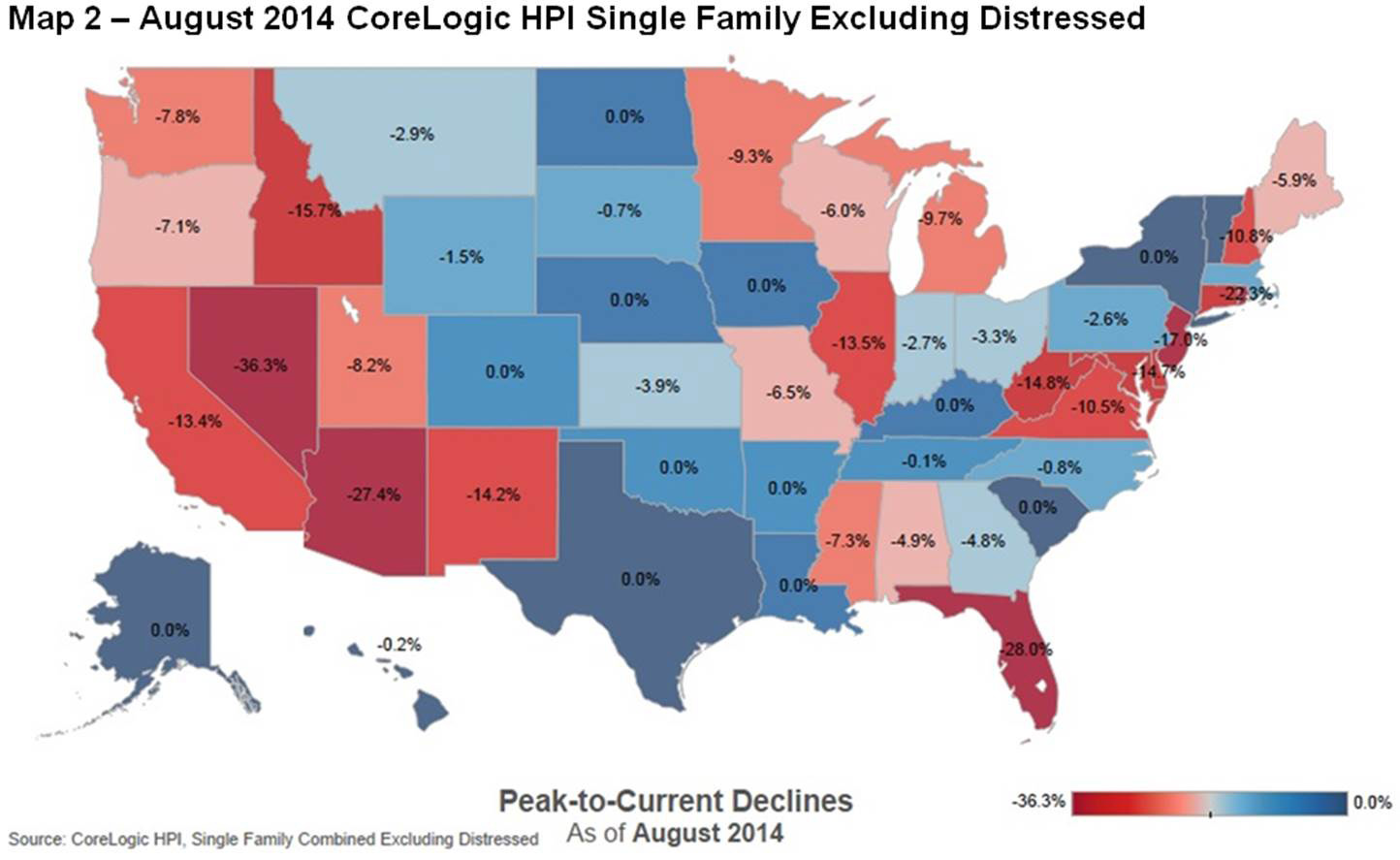 - Including distressed transactions, the peak-to-current change in the national HPI (from April 2006 to August 2014) was -12.1 percent. Excluding distressed transactions, the peak-to-current change in the HPI for the same period was -8.6 percent.