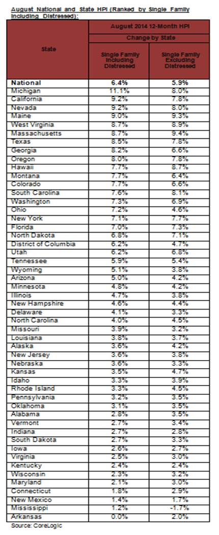 CoreLogic Reports Home Prices Rose by 6.4 Percent Year Over Year in August 2014
