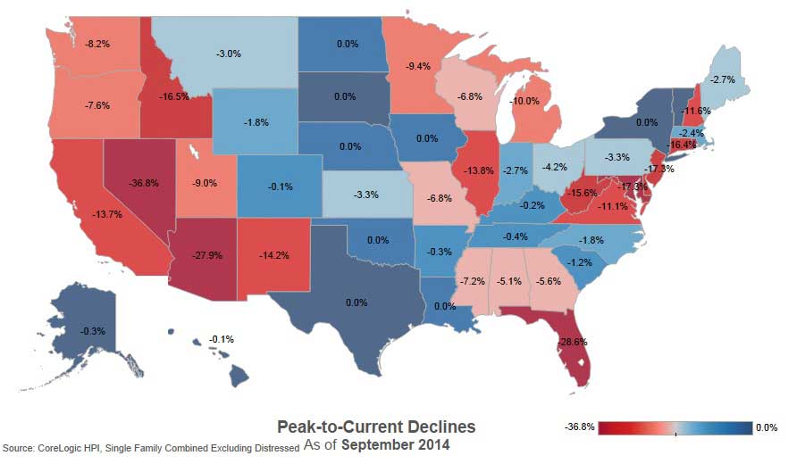 - The five states with the largest peak-to-current declines, including distressed transactions, were: Nevada (-36.6 percent), Florida (-34.1 percent), Arizona (-29.6 percent), Rhode Island (-27.9 percent) and Maryland (-21.2 percent).