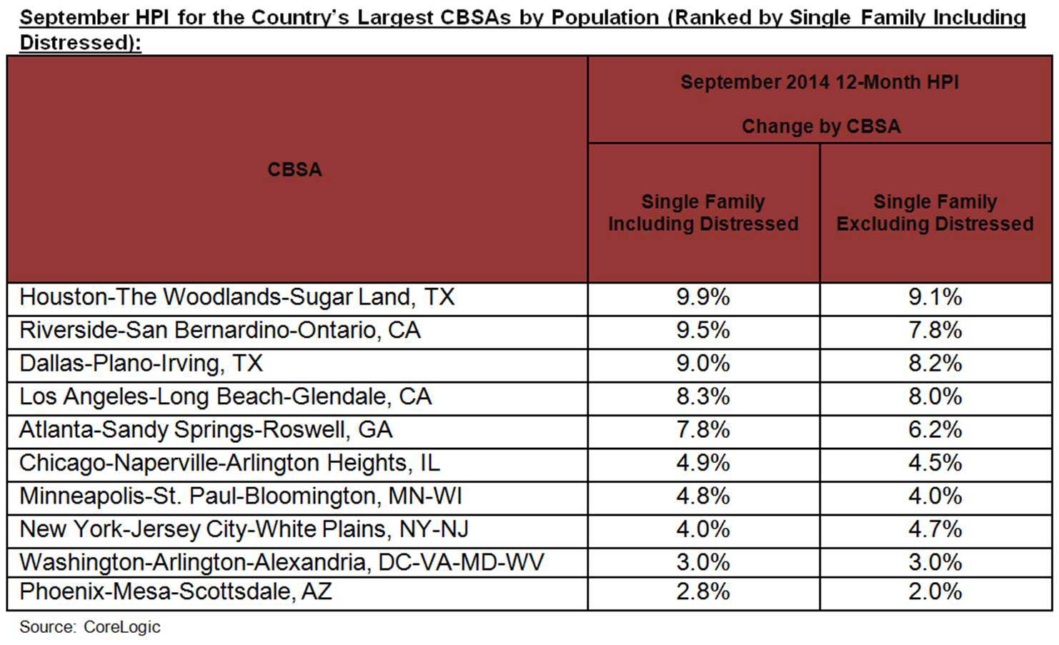 - Ninety-six of the top 100 Core Based Statistical Areas (CBSAs) measured by population showed year-over-year increases in September 2014. The four CBSAs that did not show an increase were Rochester, N.Y.; Little Rock-North Little Rock-Conway, Ark.; New Haven-Milford, Conn. and Hartford-West Hartford-East Hartford, Conn.