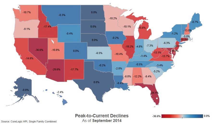 - The five states with the largest peak-to-current declines, including distressed transactions, were: Nevada (-36.6 percent), Florida (-34.1 percent), Arizona (-29.6 percent), Rhode Island (-27.9 percent) and Maryland (-21.2 percent).