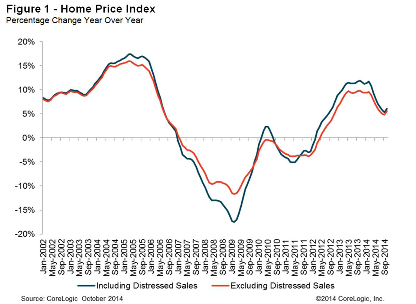 Excluding distressed sales, home prices nationally increased 5.6 percent in October 2014 compared to October 2013 and 0.6 percent month over month compared to September 2014. Also excluding distressed sales, 49 states and the District of Columbia showed year-over-year home price appreciation in October, with Mississippi being the only state to experience a year-over-year decline (-1.2 percent). Distressed sales include short sales and real estate owned (REO) transactions.