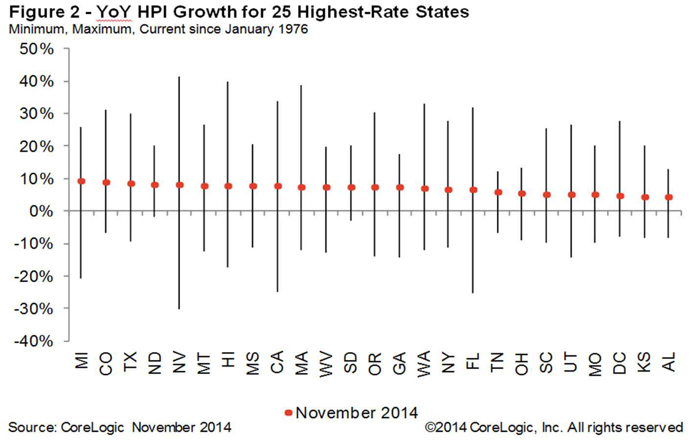 “After decelerating for most of the year, home price growth has been holding firm between a 5-percent and 6-percent growth rate for the last four months,” said Sam Khater, deputy chief economist at CoreLogic. “However, pockets of weakness are clear in Baltimore and Washington D.C., and three of the top four states with the highest price appreciation are energy intensive and had been benefitting from the energy boom which is currently receding as oil prices trend downward. These states—Texas, Colorado and North Dakota, may see some downward pressure on prices in 2015.”