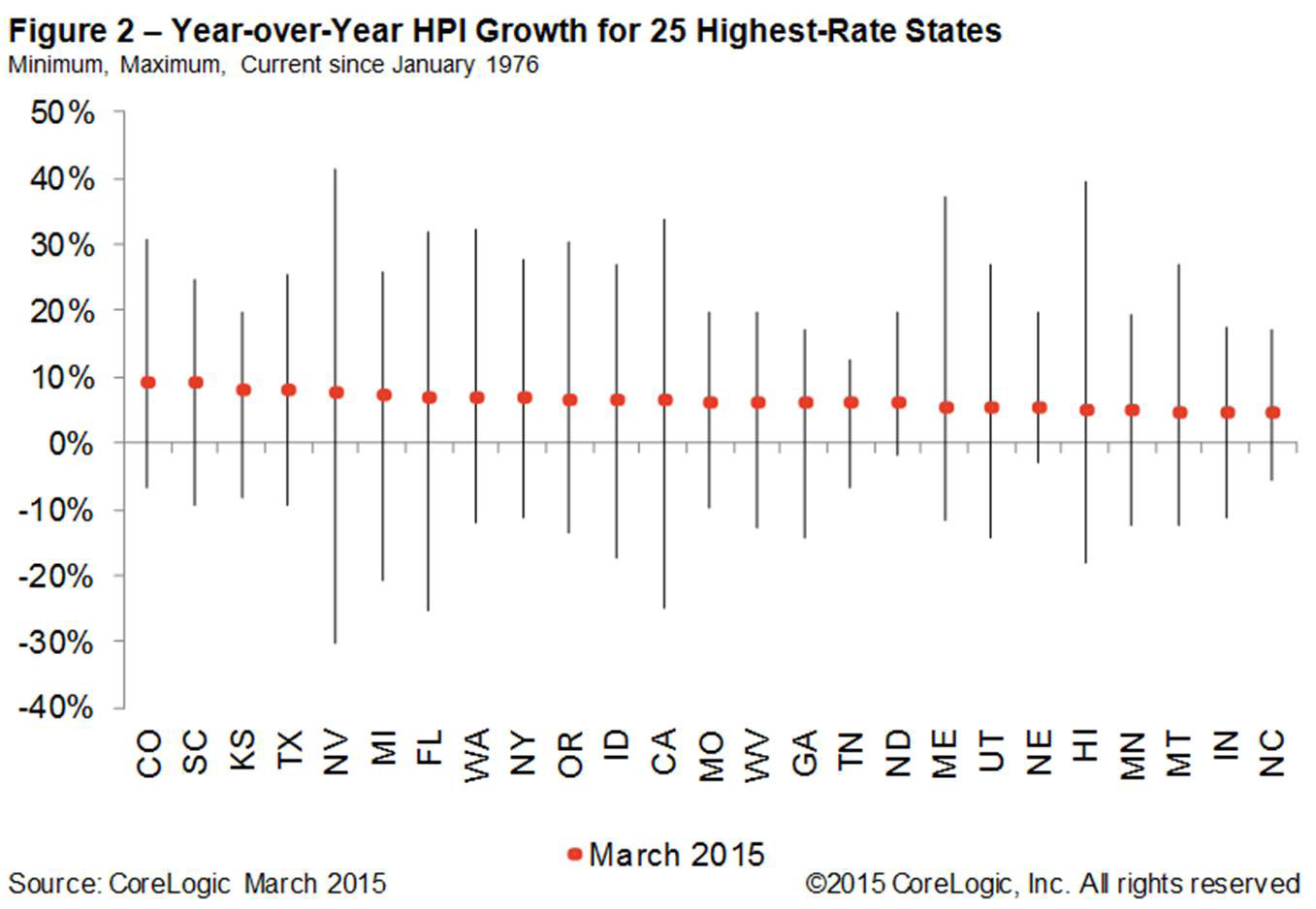Including distressed sales in March, 27 states plus the District of Columbia were at or within 10 percent of their peak prices. Seven states, including Colorado, Nebraska, New York, Oklahoma, Tennessee, Texas and Wyoming, reached new home price highs since January 1976 when the CoreLogic HPI started.