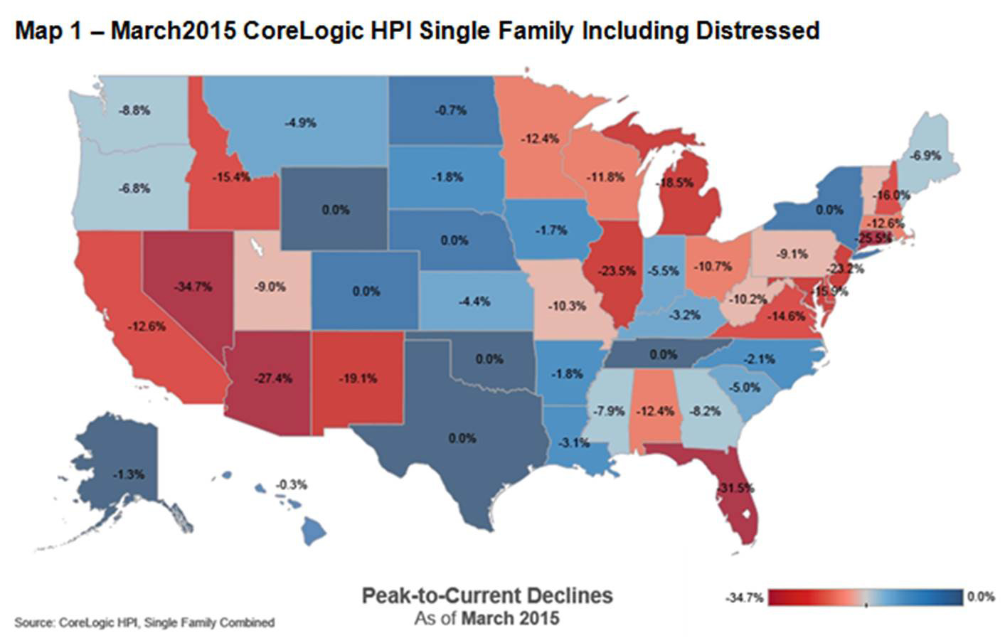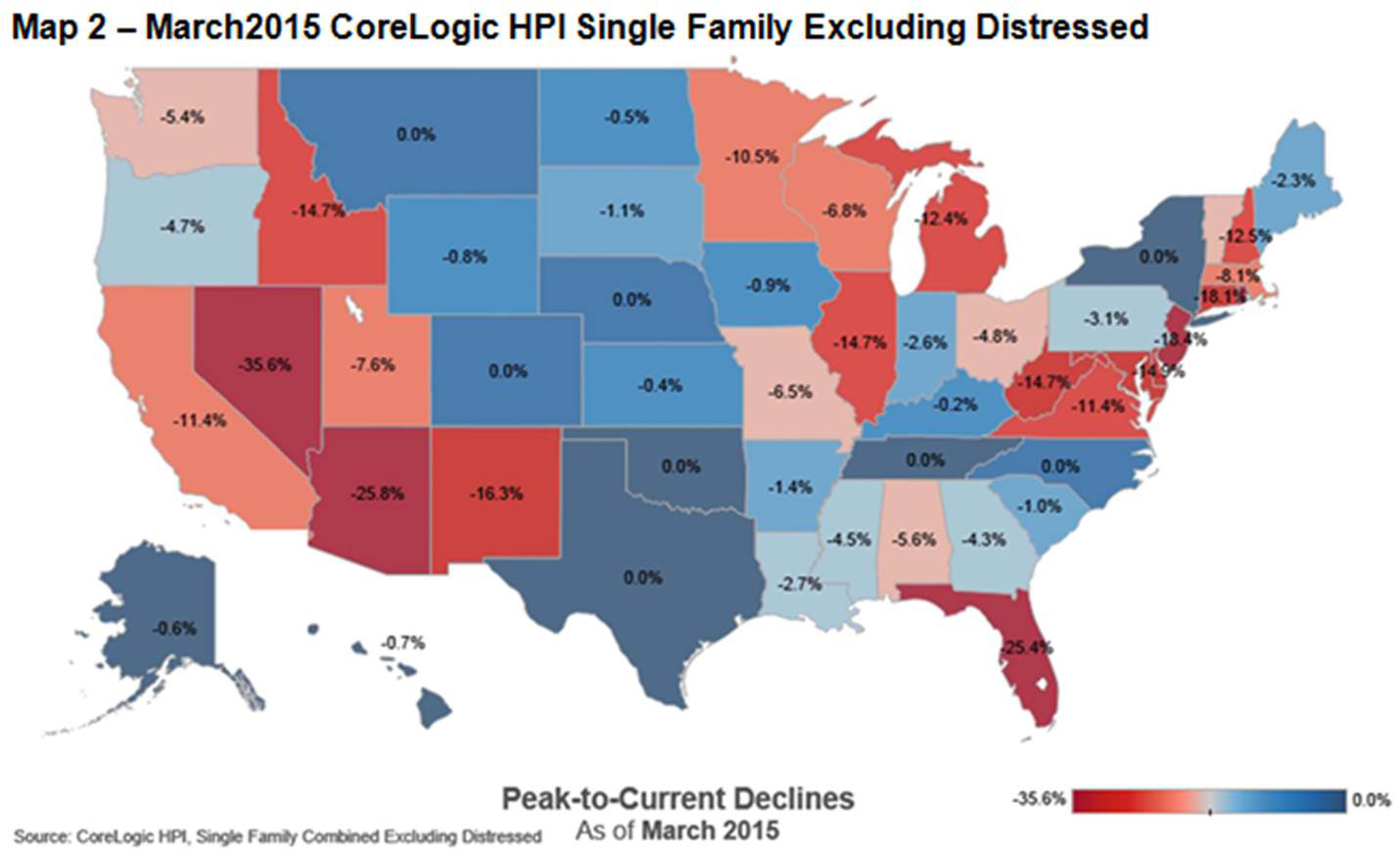 Map 1 – March 2015 CoreLogic HPI Single-Family Combined Series Peak-to-Current Declines