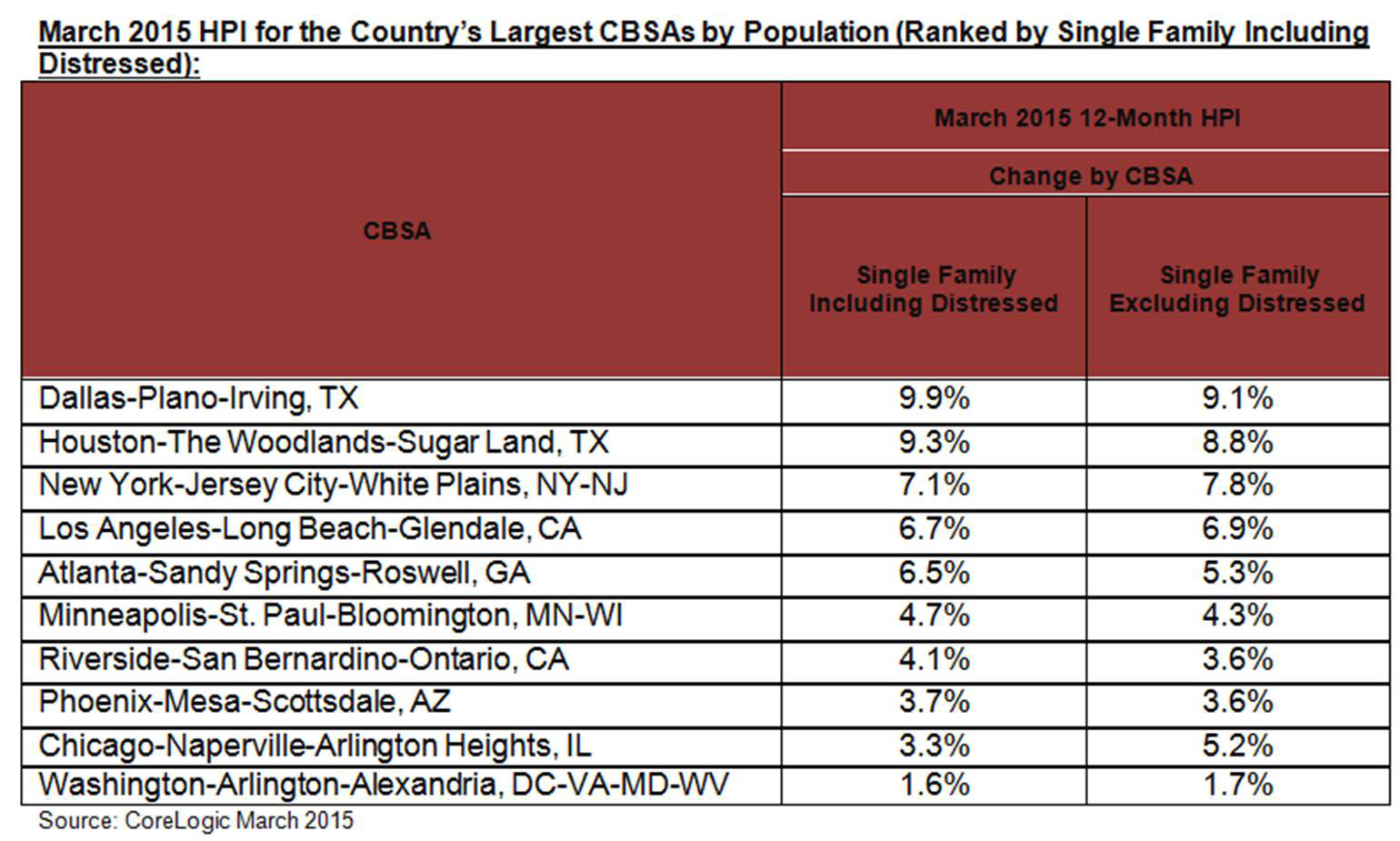 “All signs are pointing toward continued price appreciation throughout 2015. In fact, the strong month-over-month gain in March may be a harbinger of accelerating price appreciation as we enter the spring selling season,” said Anand Nallathambi, president and CEO of CoreLogic. “Tight inventories, job growth and the inexorable impact of demographics and household formation are pushing price levels in many states, and especially large metropolitan areas like Dallas, Denver, Houston, Seattle and San Francisco, toward record levels.”