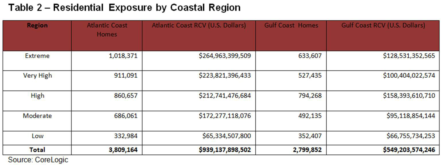 At the regional level, the Atlantic Coast has more than 3.8 million homes at risk of storm surge in 2015 with an RCV of $939 billion, and the Gulf Coast has just under 2.8 million homes at risk and nearly $549 billion in potential exposure to total destruction damage (Table 2).