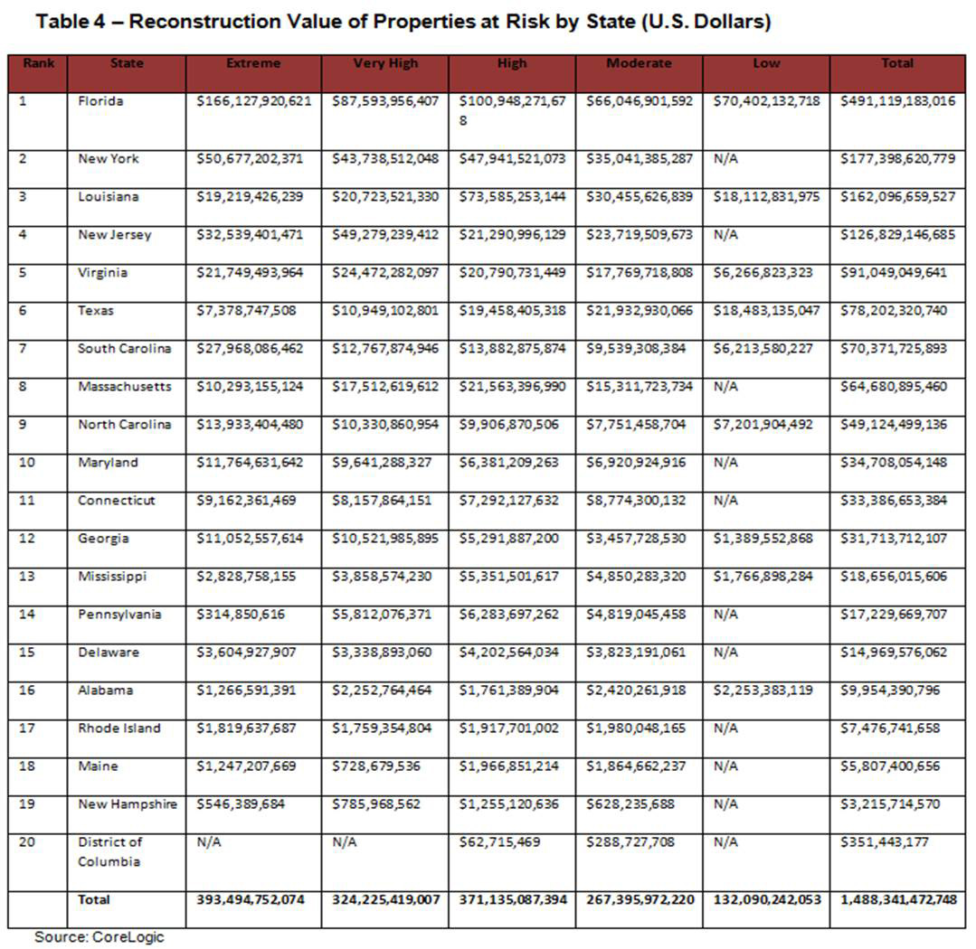 Table 4 – Reconstruction Value of Properties at Risk by State (U.S. Dollars)