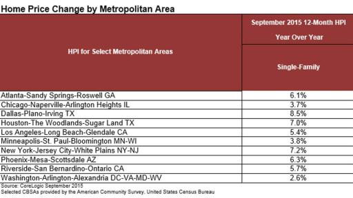 CoreLogic® (NYSE: CLGX), a leading global property information, analytics and data-enabled services provider, today released its CoreLogic Home Price Index (HPI™) and HPI Forecast™ data for September 2015 which shows home prices are up both year over year and month over month.