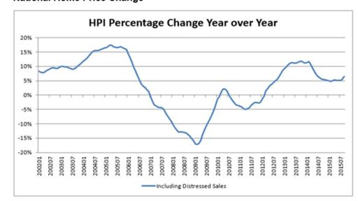 According to the CoreLogic HPI, home prices nationwide, including distressed* sales, increased by 6.4 percent in September 2015 compared with September 2014 and increased by 0.6 percent in September 2015 compared with August 2015.**