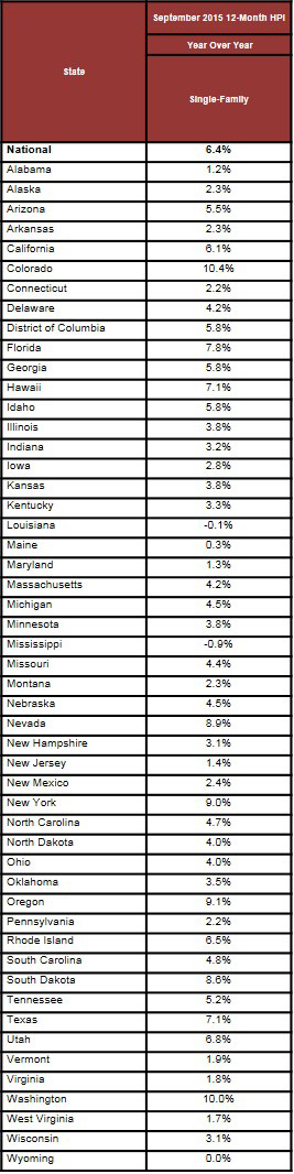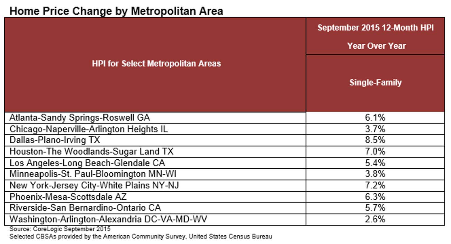According to the CoreLogic HPI, home prices nationwide, including distressed* sales, increased by 6.4 percent in September 2015 compared with September 2014 and increased by 0.6 percent in September 2015 compared with August 2015.**