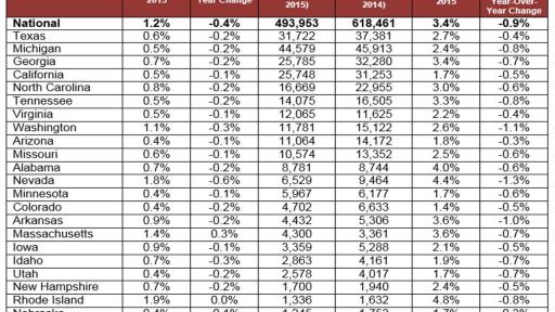 CoreLogic also reports that the number of mortgages in serious delinquency (defined as 90 days or more past due, including those loans in foreclosure or REO) declined by 21.2 percent from September 2014 to September 2015 with 1.3 million mortgages, or 3.4 percent, in this category. This is the lowest serious delinquency rate since December 2007. The foreclosure rate (defined as the share of all loans in the foreclosure process) was at 1.2 percent as of September 2015, which is back to the December 2007 level.
