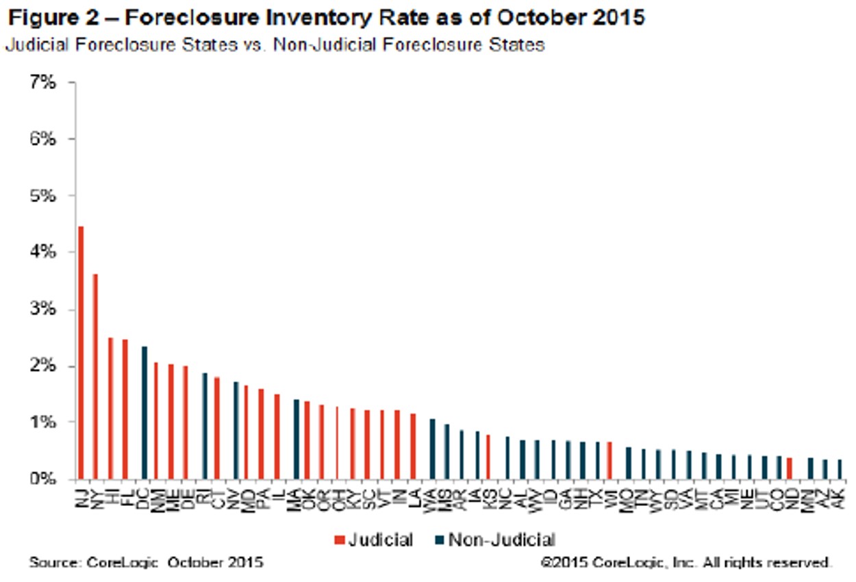 - Four states and the District of Columbia had the highest foreclosure inventory rate in October 2015: New Jersey (4.5 percent), New York (3.6 percent), Hawaii (2.5 percent), Florida (2.5 percent) and the District of Columbia (2.3 percent).