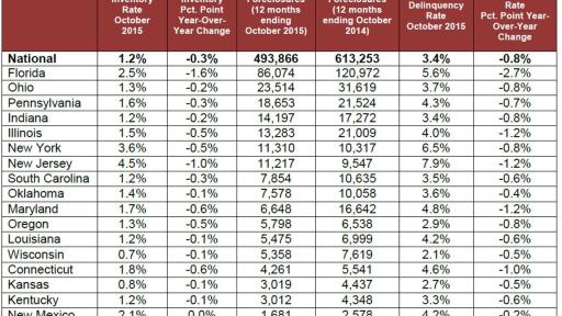 “We are heading into 2016 with the lowest foreclosure inventory in eight years thanks to escalating home values and progressive improvement in the U.S. economy. A large proportion of the remaining foreclosure inventory is clustered in New York, New Jersey and Florida,” said Anand Nallathambi, president and CEO of CoreLogic. “Equally encouraging is the drop in mortgage delinquency rates reflecting the stronger labor market and tighter underwriting since 2009.”