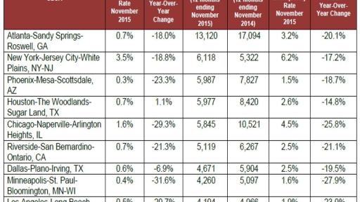 CoreLogic® (NYSE: CLGX), a leading global property information, analytics and data-enabled services provider, today released its November 2015 National Foreclosure Report which shows the foreclosure inventory declined by 21.8 percent and completed foreclosures declined by 18.8 percent compared with November 2014. The number of completed foreclosures nationwide decreased year over year from 41,000 in November 2014 to 33,000 in November 2015. The number of completed foreclosures in November 2015 was down 71.6 percent from the peak of 117,657 in September 2010.
