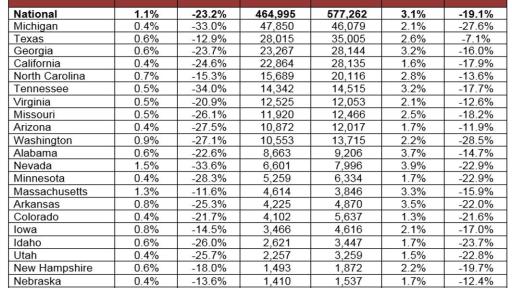 - The five states with the highest number of completed foreclosures for the 12 months ending in March 2016 were Florida (69,000), Michigan (48,000), Texas (28,000), Georgia (23,000) and California (23,000). These five states accounted for about 41 percent of all completed foreclosures nationally.