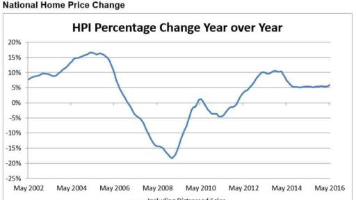 Home prices nationwide, including distressed sales, increased year over year by 5.9 percent in May 2016 compared with May 2015 and increased month over month by 1.3 percent in May 2016 compared with April 2016,* according to the CoreLogic HPI.