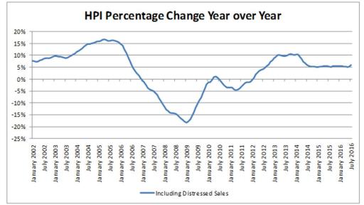 Home prices nationwide, including distressed sales, increased year over year by 6 percent in July 2016 compared with July 2015 and increased month over month by 1.1 percent in July 2016 compared with June 2016,* according to the CoreLogic HPI.
