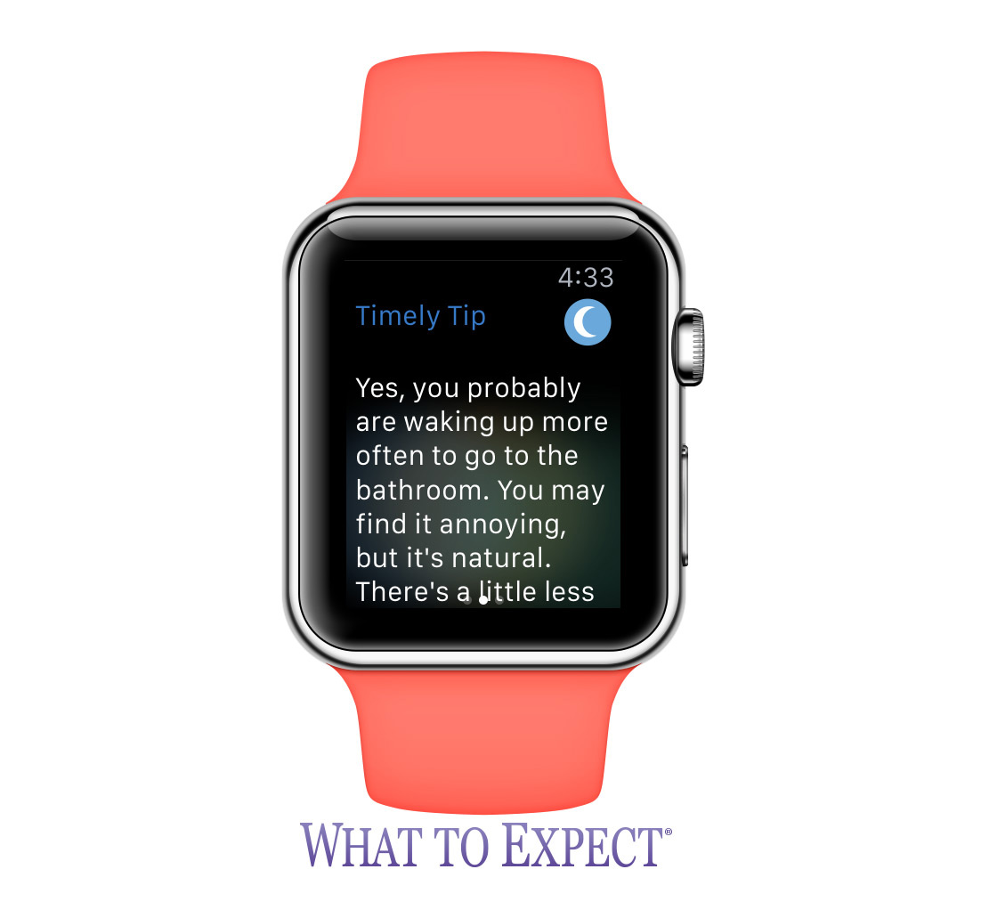 “Pregnancy is a waiting game — so what better way to ‘count down to baby’ than with a What to Expect Apple Watch app?" says Heidi Murkoff, creator of What to Expect. "With this perfect combination of What to Expect content and Apple technology, parents-to-be can check in on the progress of their pregnancy, keep tabs on their growing baby, and get completely personalized information and updates, hour-by-hour, day-by-day, week-by-week for the whole nine months.....all at the flick of a wrist. Talk about an idea whose time has come!”
