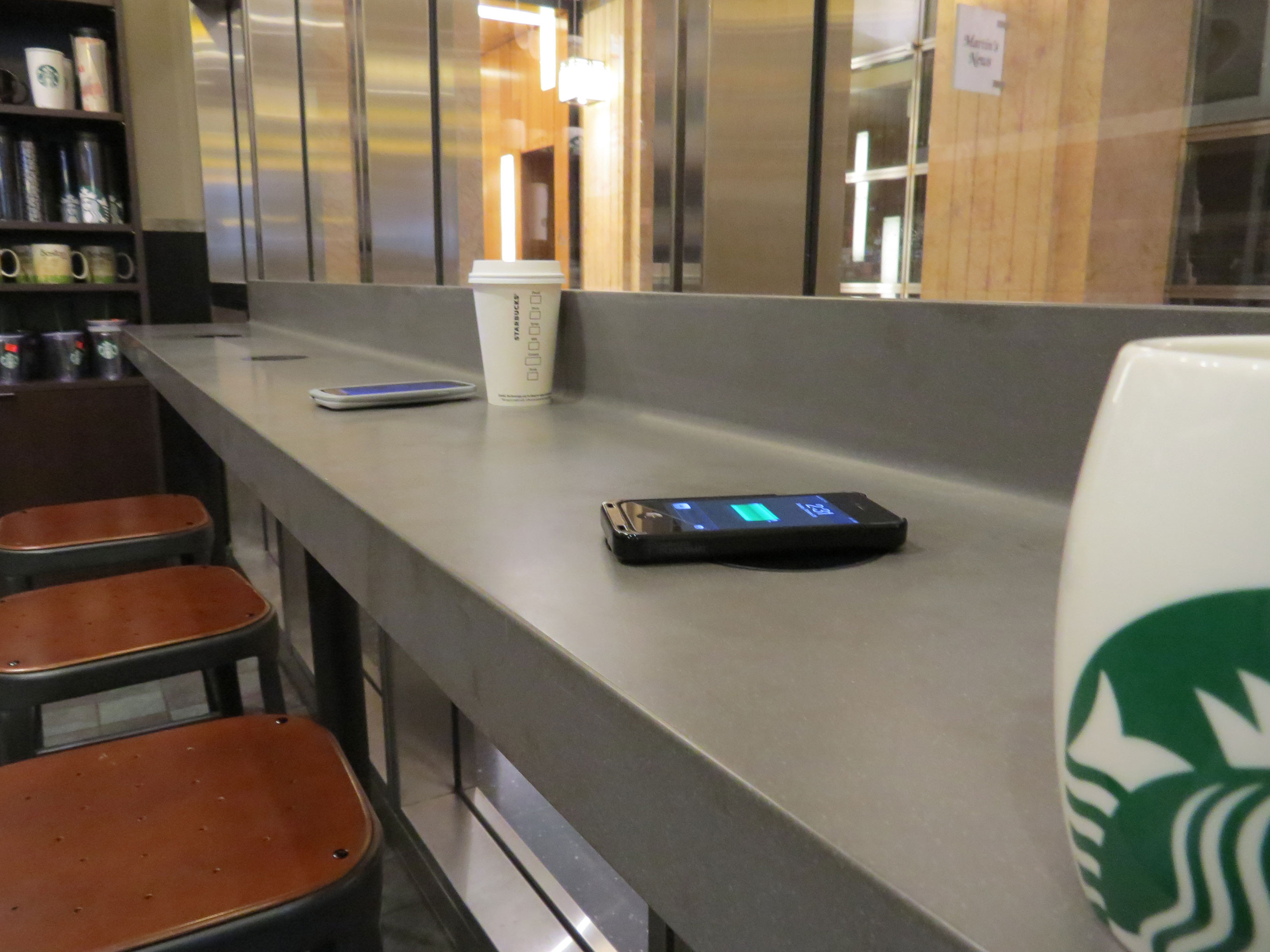 Starbucks signage with Powermat, consumers using product - powermatting