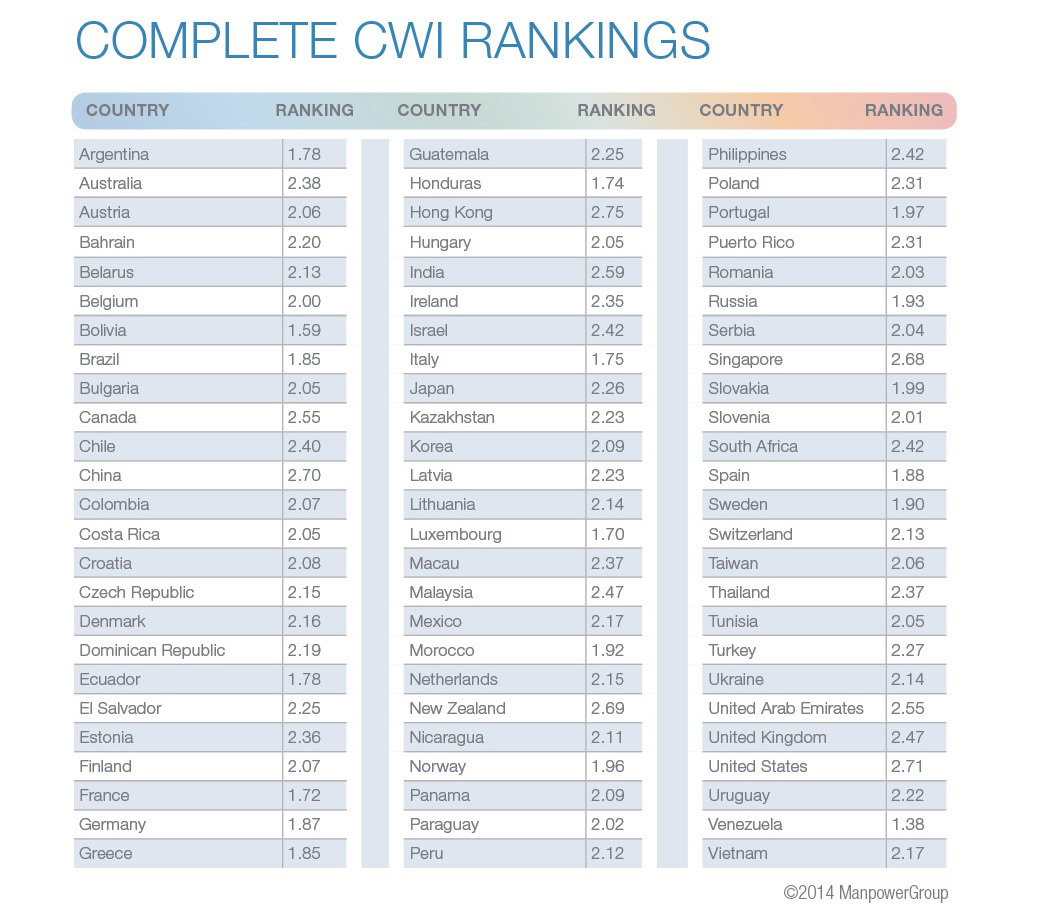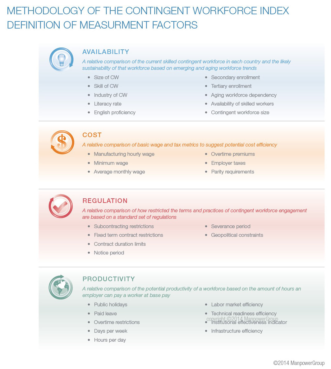 The second annual CWI was refined and enhanced to assure the analysis and results reflect the constantly evolving world of work trends. For example, additional insight into regulations and workforce dynamics, such as “language proficiency” was added. Moreover, with greater emphasis placed on the size of countries’ contingent workforces, countries with large populations or pools of contingent labor rose in the rankings. Consequently, decreased rankings were observed for countries with smaller contingent labor pools or higher costs.