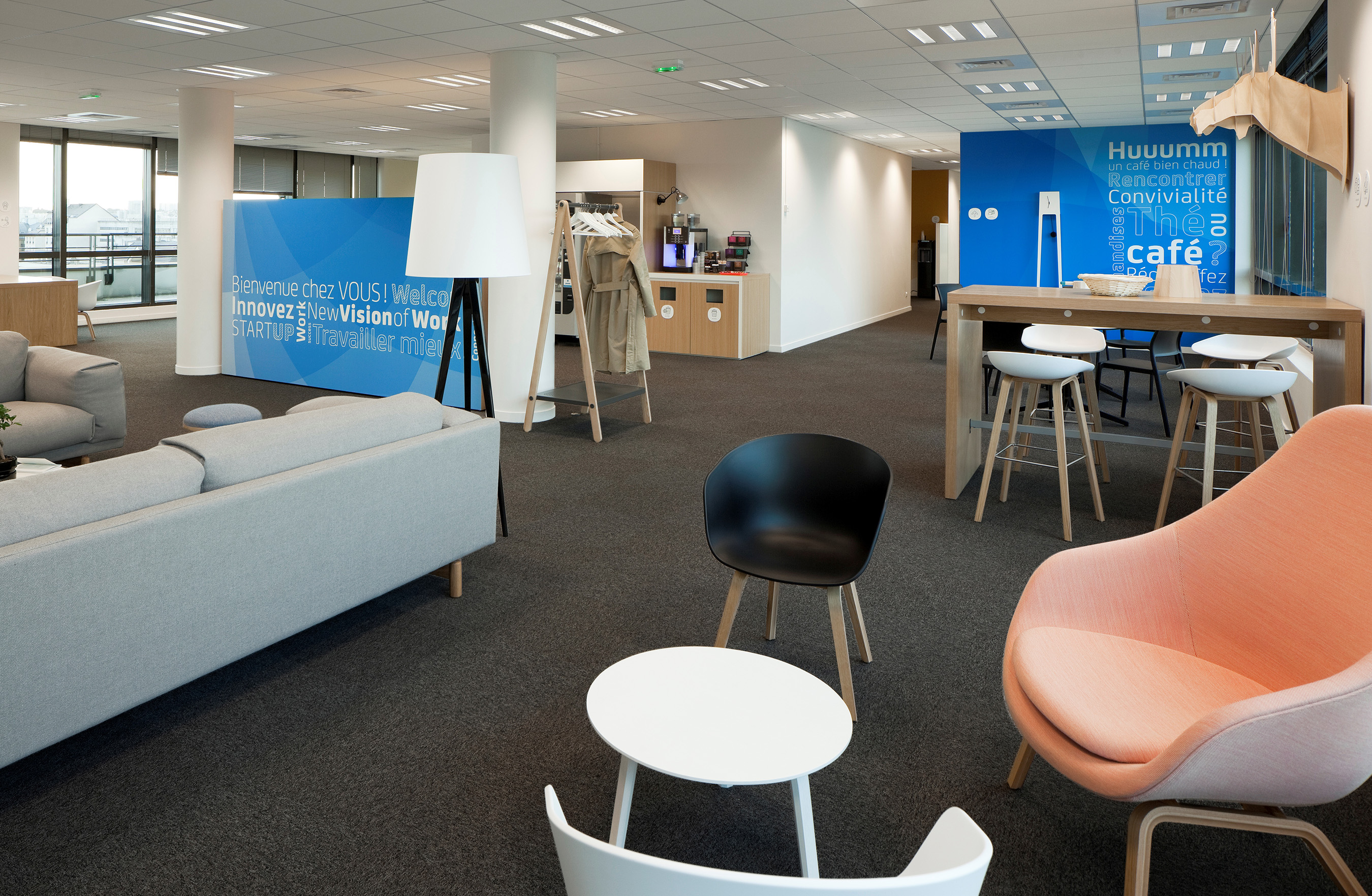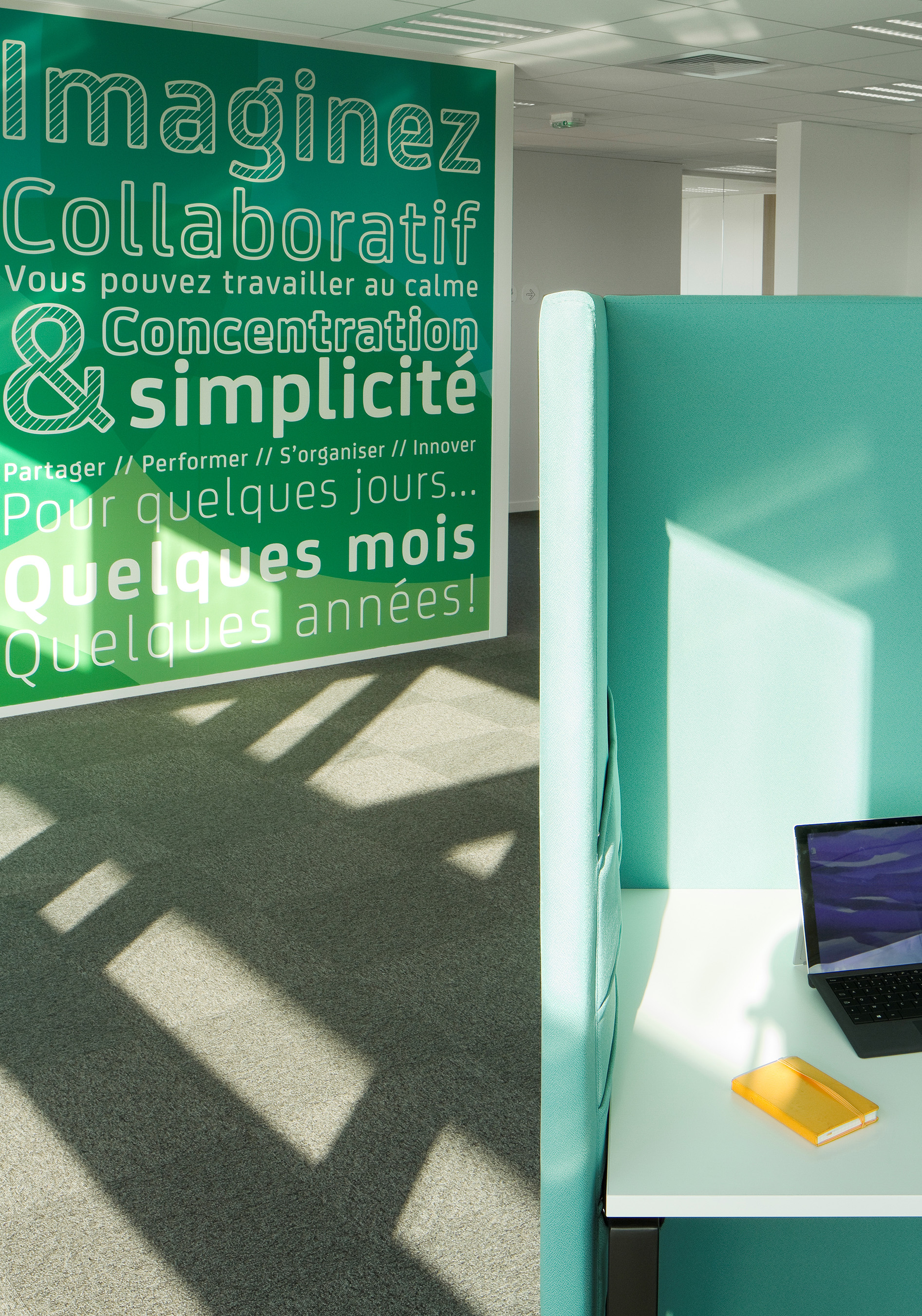 La création de ce concept de tiers-lieu est en droite ligne avec notre philosophie de mêler Art de vivre au travail et efficacité. Art de vivre dans un lieu en rupture avec l’univers « classique du bureau », par des mobiliers, des codes de formes, des codes couleurs et graphiques résolument optimistes, contrairement à des aménagements plus traditionnels parfois anonymes et ternes. Efficacité dans la multiplicité de lieux qui sont mis à disposition des utilisateurs pour répondre au rythme de leur journée : un espaces lounge, des espaces de partage, des espaces de travail ouverts, de confidentialité… Efficacité également dans les services et les outils qui seront mis à la disposition des collaborateurs.