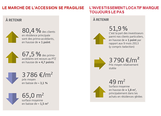 - Le nombre d’acquisitions en résidence principale recule par rapport aux 9 premiers mois 2013. Le pouvoir d’achat de nos clients accédants se contracte : ils achètent des logements plus petits et moins chers.