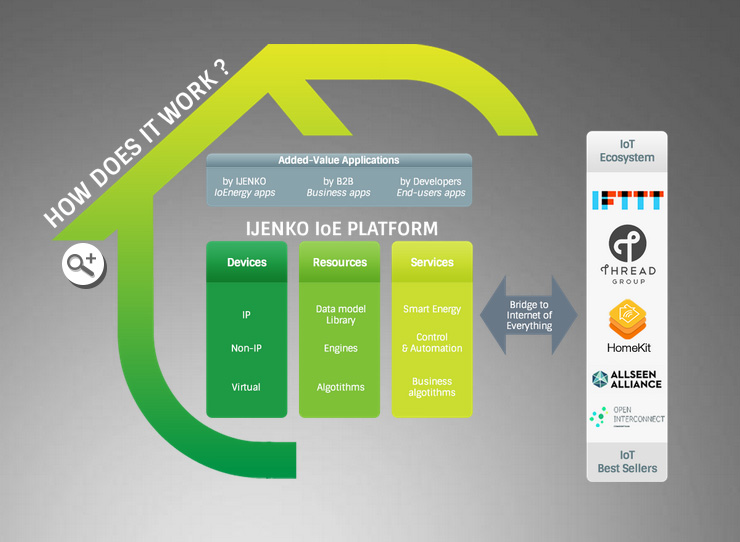 Based on open cloud technologies and a complete set of APIs, the IJENKO IoE2 platform enables service providers to deliver end user services in the field of energy management and home automation using low-power devices such as Zigbee, EnOcea and others, as well as IP devices and services. With IJENKO’s IoE2 , service providers can have their own services and devices interact with other IoT devices, platforms or frameworks such as IFTTT, Thread, Homekit, OIC, AllJoyn, and allow developer communities to create unified services and applications.