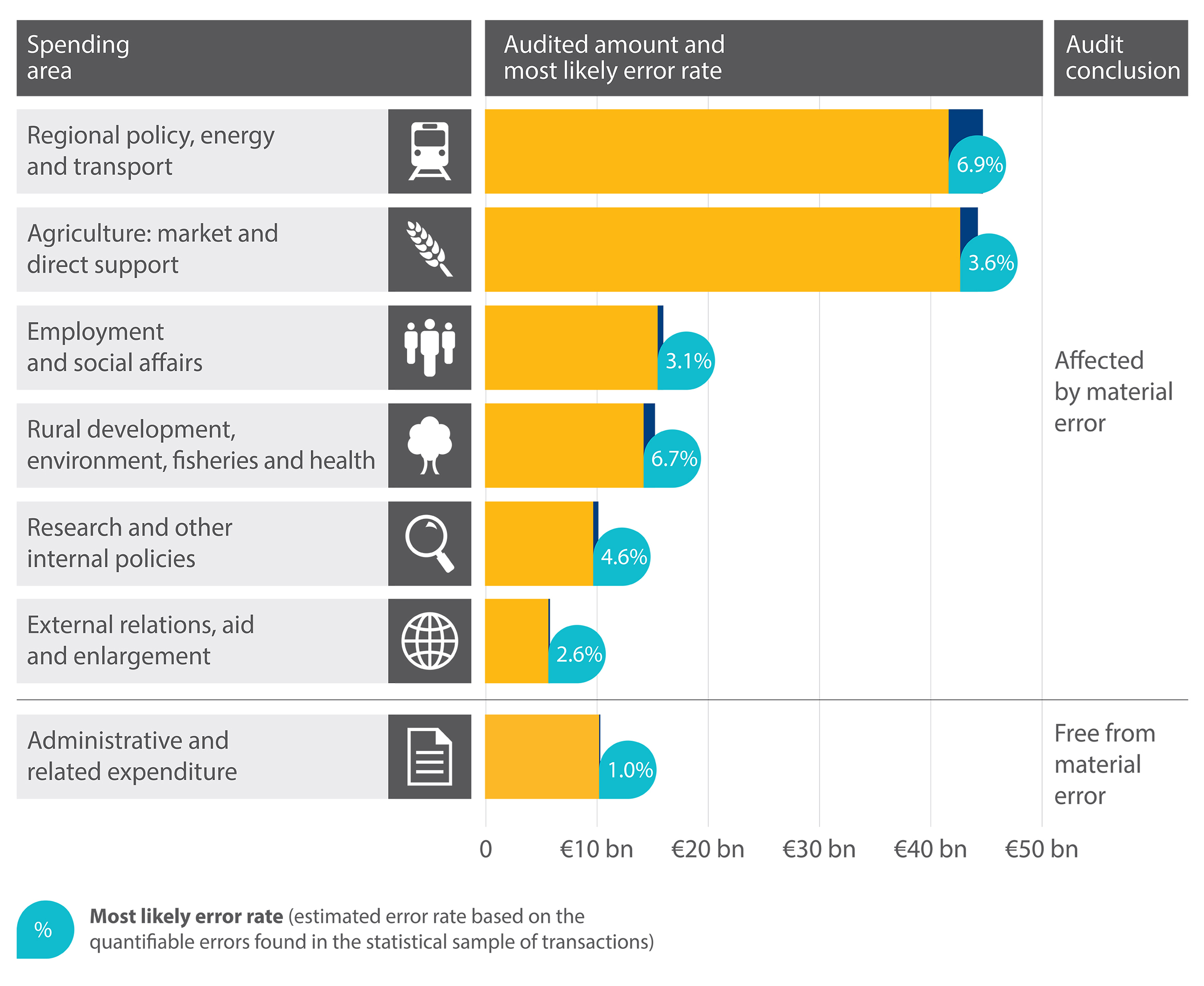 In their annual report for 2013, the EU Auditors give a clean opinion on the reliability of the EU accounts. They also conclude that the collection of EU revenue was free from error. However, for EU expenditure the estimated error rate was 4.7 % (compared with 4.8 % in 2012). The ECA’s estimate of the error rate is not a measure of fraud, inefficiency or waste. It is an estimate of the money that should not have been paid from the EU budget because it was not used in accordance with EU rules. Typical errors include payments to a company declared as an SME, which is in fact owned by a large company, or making additions to an existing public contract without giving other tenderers a chance to bid.