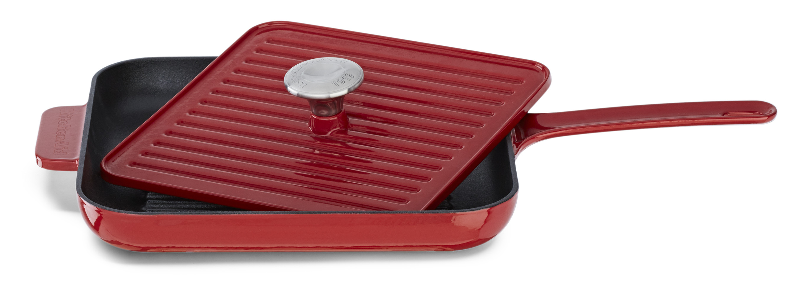 The new cast iron grill pan with panini press is designed with raised ridges across the entire pan, delivering similar results to that of an outdoor grill. The panini press insert features raised ridges underneath for simultaneously producing grill marks on both sides of foods, such as meats and sandwiches. The 10” by 10” grill pan and panini press will be available in the coming months in Almond Cream, Empire Red and Onyx Black at a suggested retail price of $199.99.