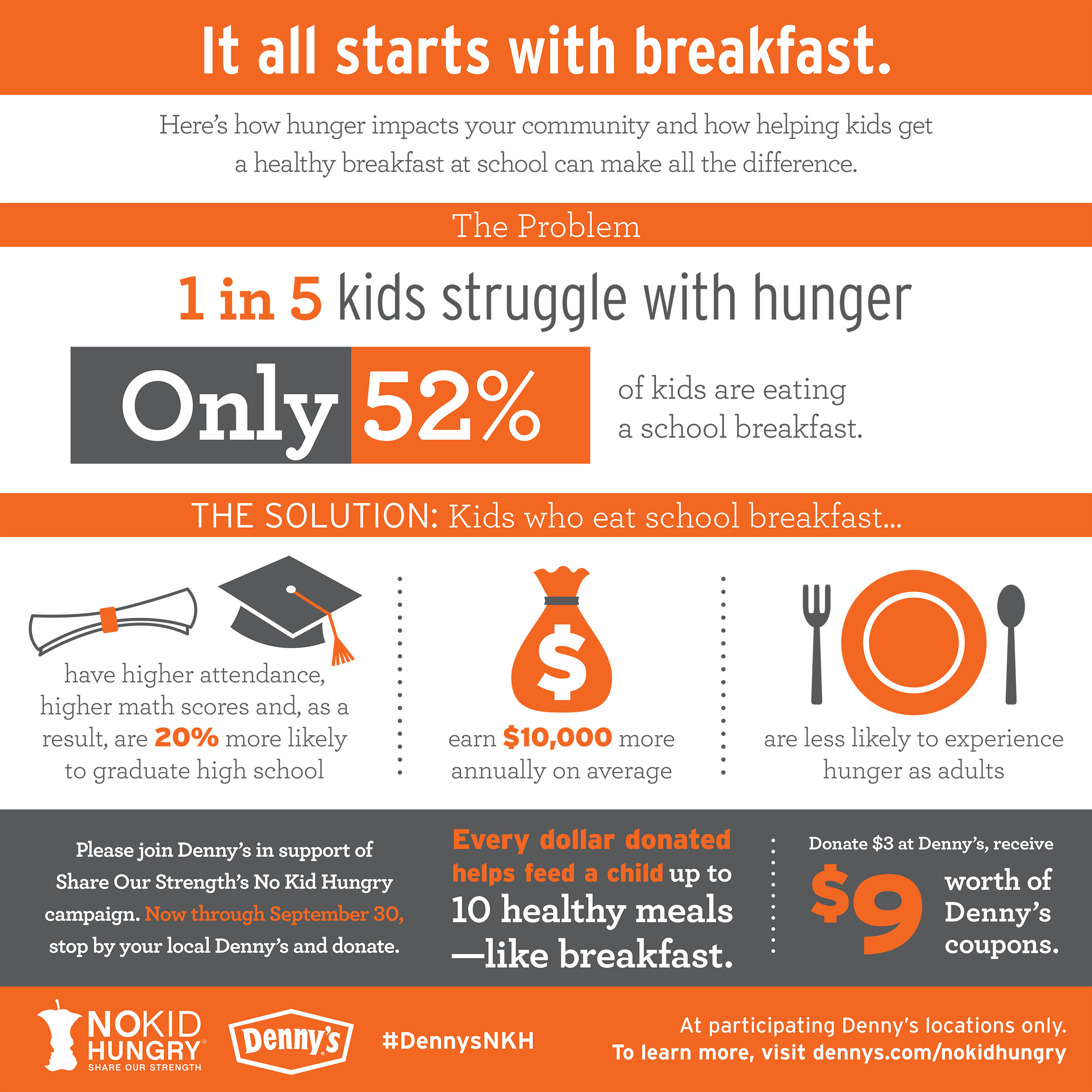 “We are grateful for Denny’s continued commitment,” said Billy Shore, co-founder of Share Our Strength. “It matches the commitment of our nation’s teachers who see their students regularly coming to school hungry and who know that academic success can be measured in meals—especially breakfast in the school day. By dining out at your local Denny’s, pledging your support online or even just buying a t-shirt, you’re helping every child get that most important meal of the day and making No Kid Hungry a reality.”