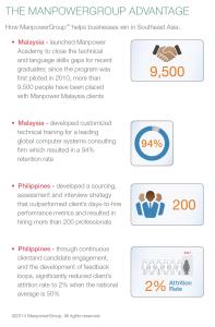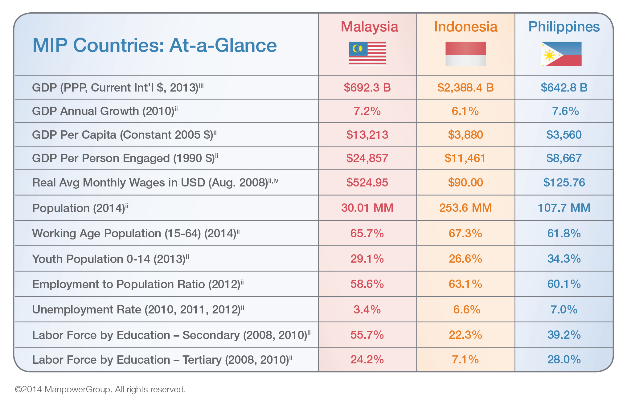 “Companies that fully understand that their greatest asset is talent will be able to maximize the opportunities the MIP markets offer,” said Danny Yuan, Chief Operating Officer, ManpowerGroup Asia Pacific and Middle East. “In times of compressed margins and pervasive economic uncertainty, businesses cannot continue to operate as usual. To outpace their competitors, they must look for new possibilities. The sustainable demographic trends observed in Malaysia, Indonesia and the Philippines will enable businesses investing in these markets to successfully grow their operations.”
